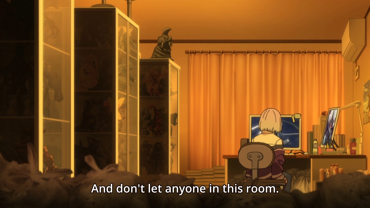 — But according to Alexis, the UFO belongs to Anti. And when Akane hears that Alexis had assisted Anti in creating the kaiju (does a UFO even count as one? I thought you had to be a giant monster) she smashes her monitor. I think she’s mostly pissed off at the fact that someone was allowed into her room.