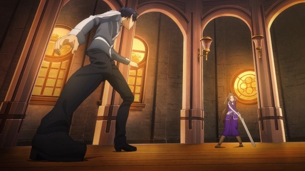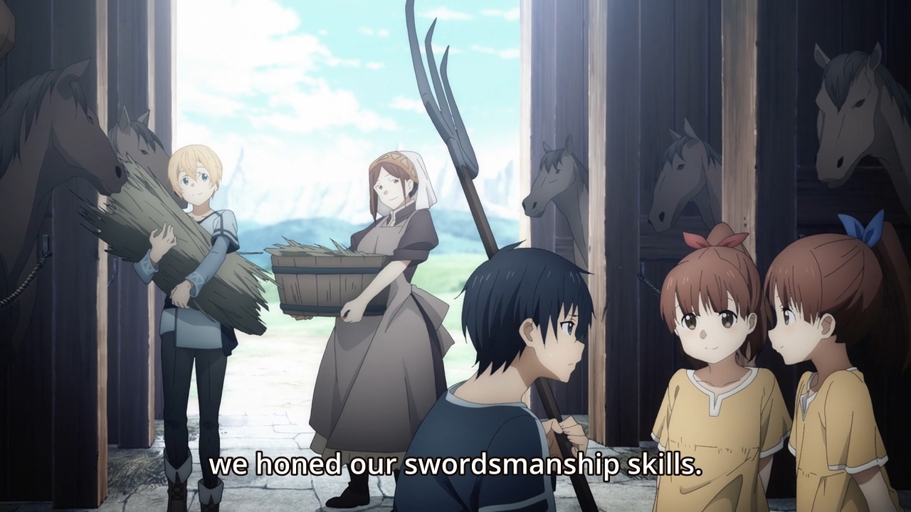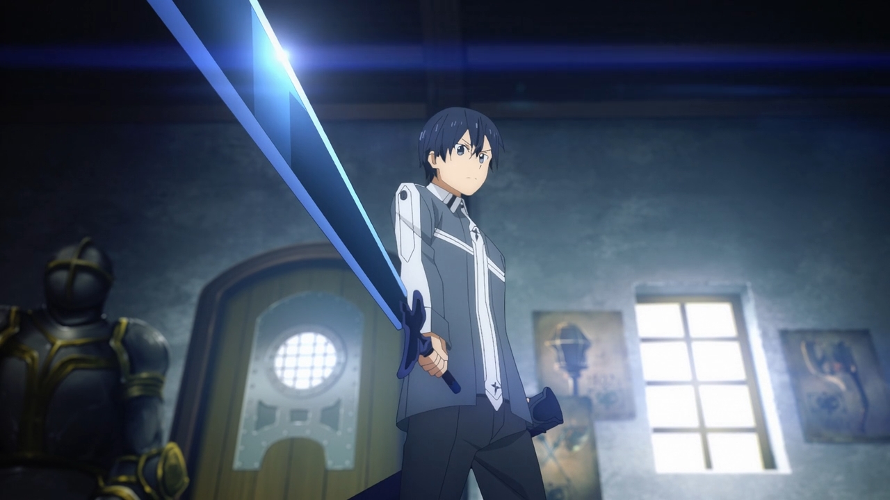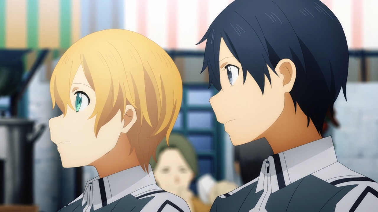— The episode opens with Eugeo dragging Kirito out of bed. They’re at some swordcraft academy — literally a giant school just for swordcraft? — and it looks like they’ve been doing this for quite some time now. Two years, in fact. Two in-game years since they’ve left their dinky starter village! But it’s okay, because barely any time has passed in the real world! The flow of time is not quite convoluted. Just sped up.