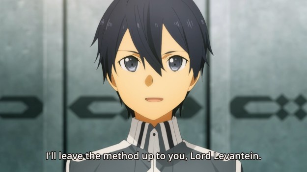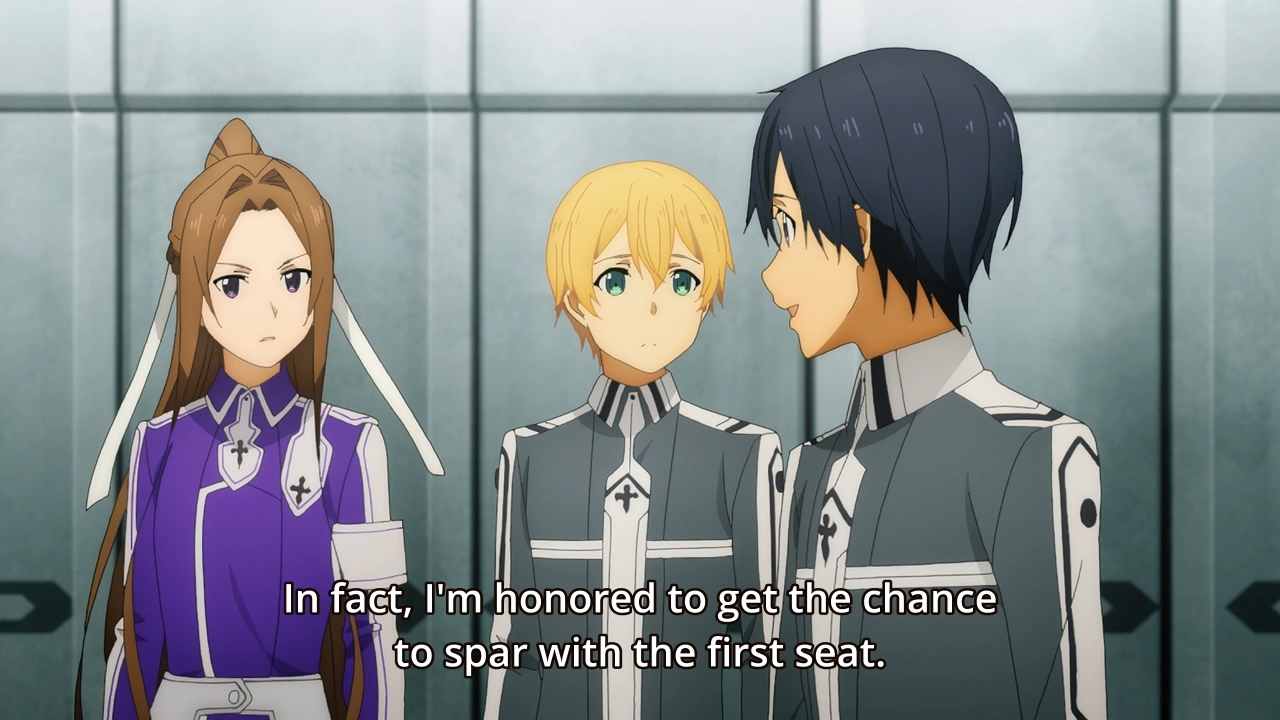 — Apparently, Kirito’s been holding back, so the lady insists that he show her his true strength! But that’ll have to wait, because, uh… curfew. Well, I guess we’ve never stuck Kirito in a bland academy setting, so this is the perfect opportunity to do so!