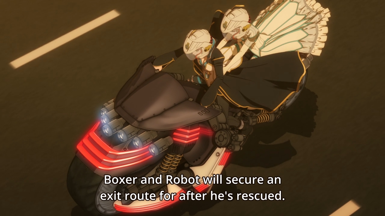 — So what’s the brilliant plan? With the jet roller skates and jet pack, Kirill will swoop in and retrieve Doug. Meanwhile, Deana will be firing explosive rounds that will cause a distraction and confuse Esperanza. Last but not least, Max and Yuri will be flying the escape helicopter once Doug and Kirill rendezvous with them. Neat. I like these operations that require the entire team to pitch in. Because this isn’t a very long series, we haven’t had any opportunity to see everyone work together like this. It’s too bad this anime doesn’t get to be two-cour like Tiger & Bunny.