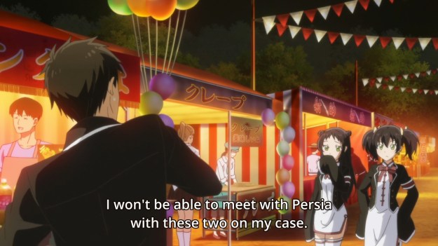 — The loli twins didn’t exactly see who Romio was talking to earlier, but he still freaks out and comes up with a bad cover story. But if you think he’s stupid, Hasuki, who had dropped by at one point, actually believes him. Dumb and dumber…