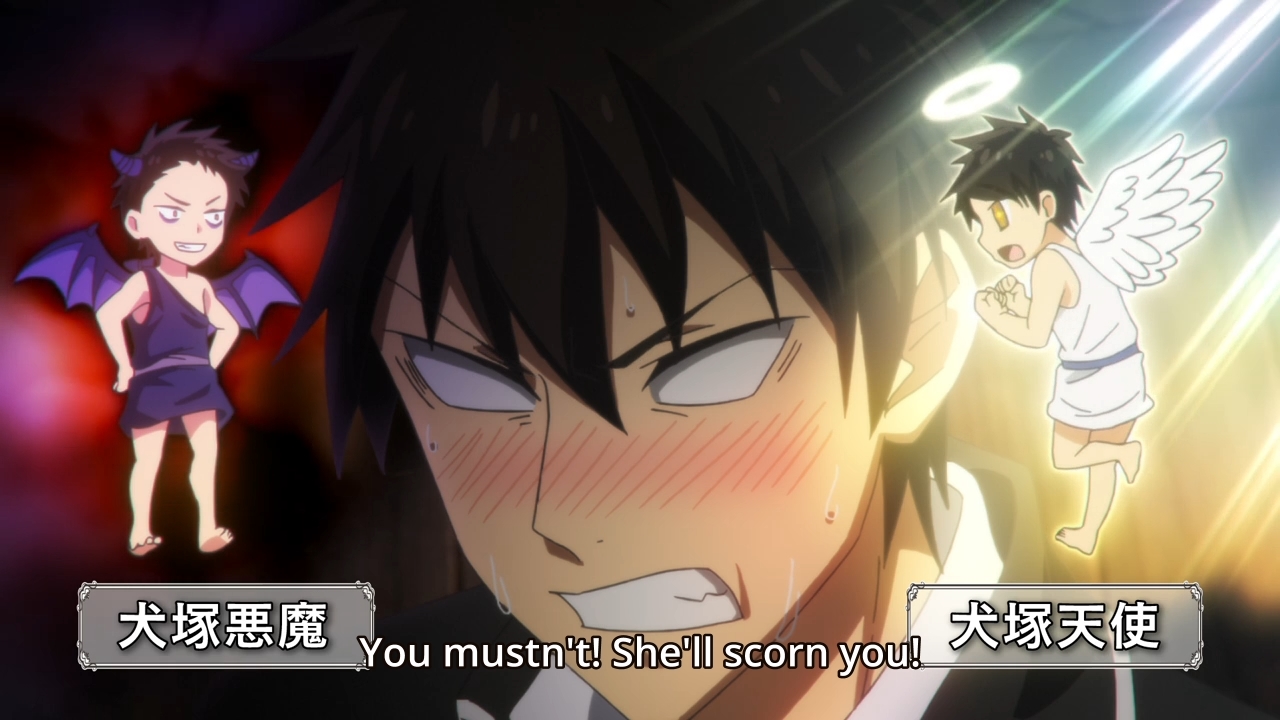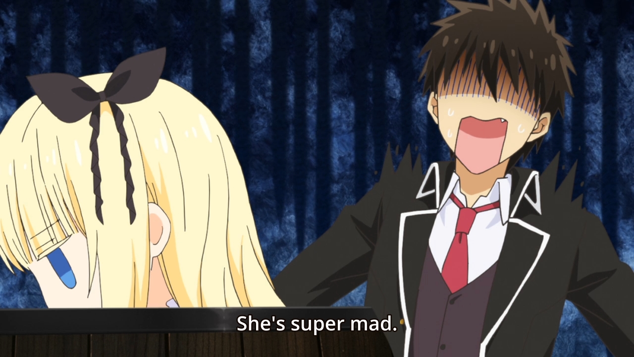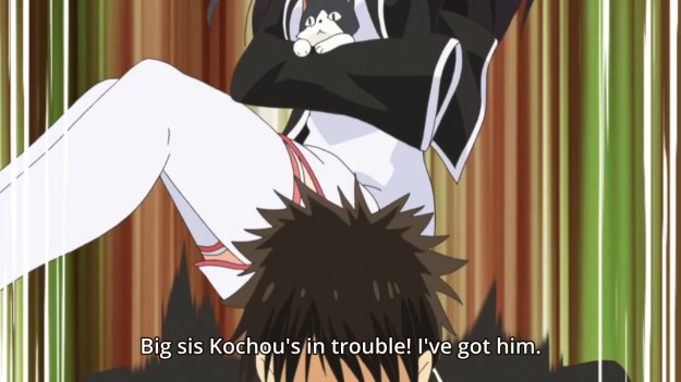 — As soon as Juliet leaves, Kochou literally falls into Romio’s lap. And like all of the other female characters on this show, she looks like she’s 5. Romio then shoots himself in the foot by inadvertently groping her (non-existent) chest. But this is anime, so if someone touches you in a bad place, just get violent with them.