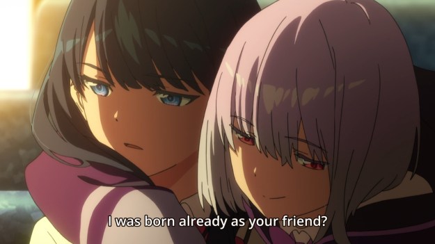 — Finally, Akane tells Rikka that everyone is made to worship her. But again, this raises more questions than it answers. If she can do this, why can’t she also make a world that wouldn’t annoy her as much as this one seems to? Akane is always complaining about something. Complaining about going outdoors. Complaining about the school festival. Complaining about people messing up her weird hot dog sandwich. If you can make everyone worship you, why can’t you just make them not piss you off? Well, maybe the problem isn’t her creations. Maybe the problem is Akane. No matter who and what she ends up creating, she’ll never be satisfied. Because at the end of the day, we all have a hard time being happy. Maybe even a god can’t make herself be happy.