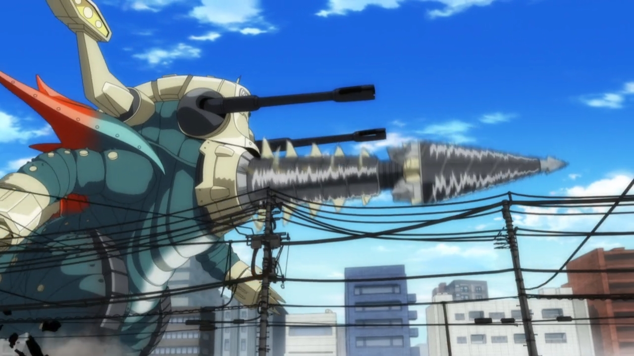 — That kaiju’s head just turned into a drill. That’s so silly. Your foe can just yank your head off! In fact, that’s exactly what happens.