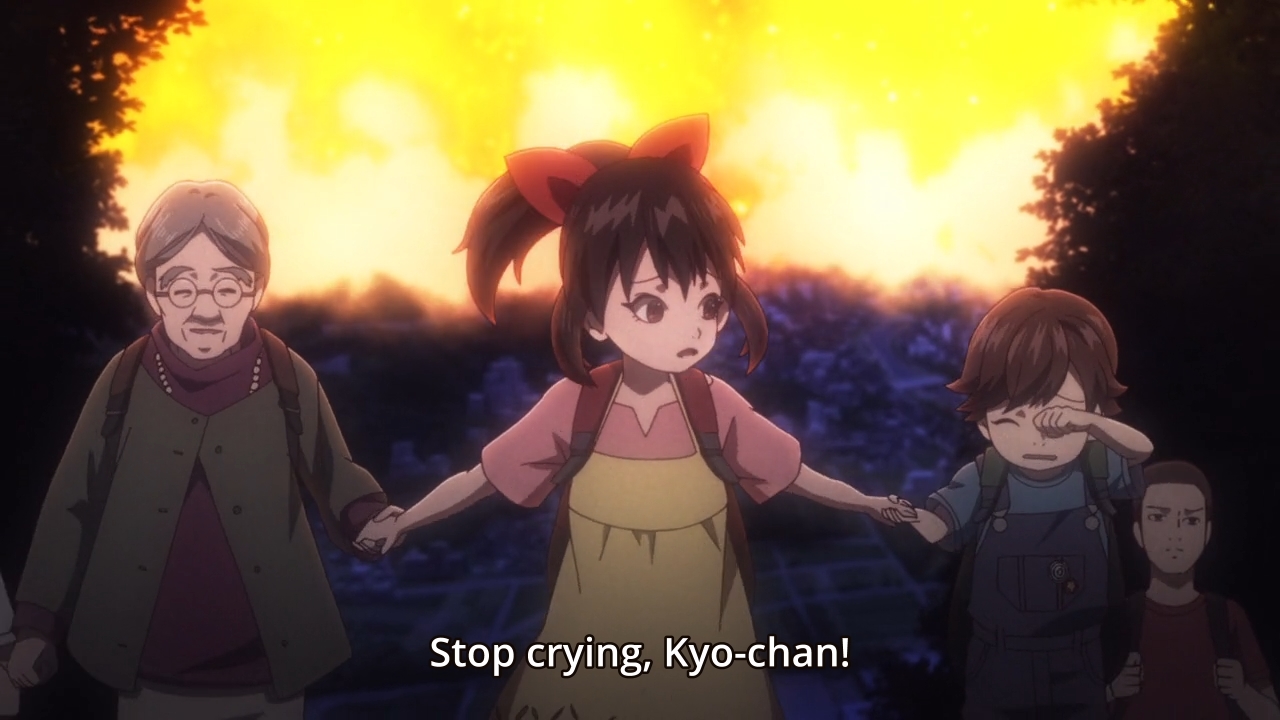 — At the very start of the episode, we get to see what had happened to Seriouska’s fragment… kinda. Twilight just showed up one day and started eating the world? Well, Seriouska was trying to help her brother and grandma get to safety, but when she takes her attention off of Kyo for just a second, he’s magically gone. Hm. Plus, we never see him in any of the other fragments either. Why is it that? What makes him so special?