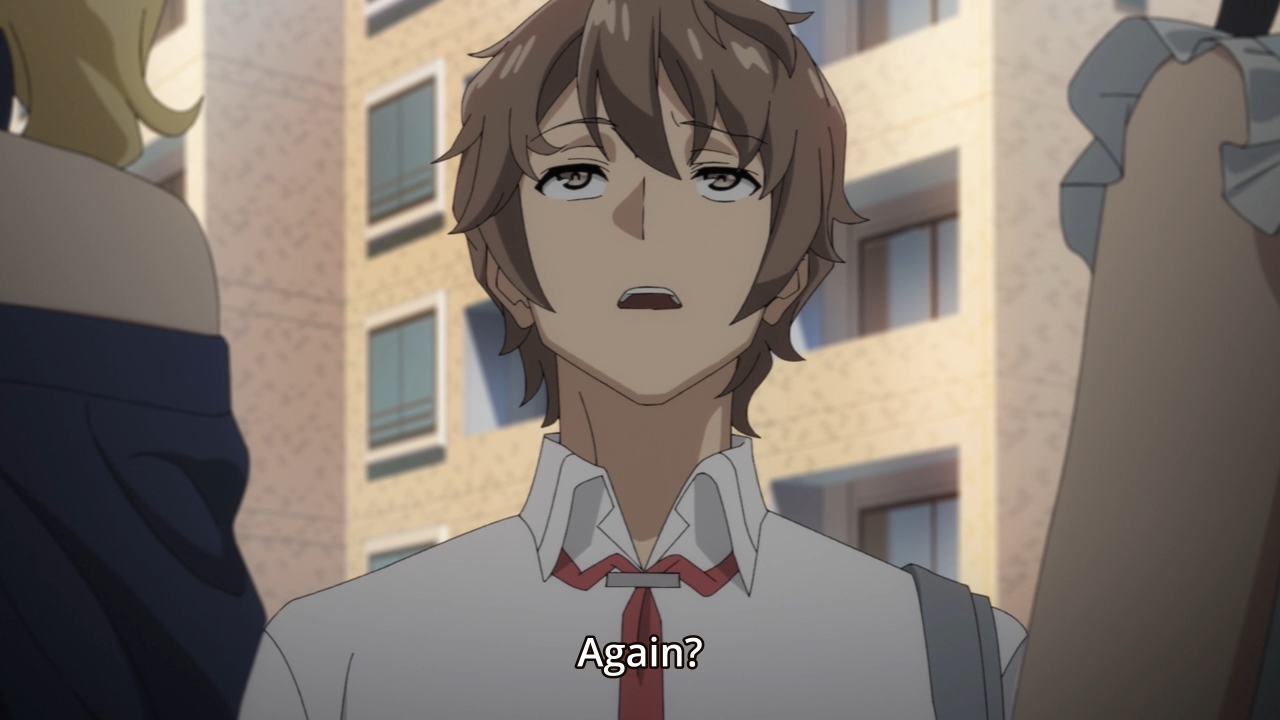 — At the start of the episode, we learn that the new school term has begun, but Mai is nowhere to be found. Not only that, this comes as a surprise to Sakuta. Okay, I understand that he doesn’t have a cellphone, so she can’t exactly text him. But does the guy not have a computer either? Can she not email him? Can she not let him know ahead of time that she won’t show up to school? Some aspects of this show are just really hard to swallow.