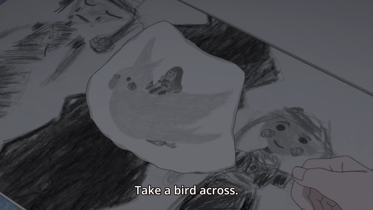 — Yuito finally stumbles upon a younger Hitomi drawing the same sorrowful subject over and over: a picture of a giant chasm between her and her sad mother. The guy proceeds to sit down and start drawing. He offers various solutions to help the girl bridge the gap, but she rejects all of them. Still, he continues to sit next to her and draw.