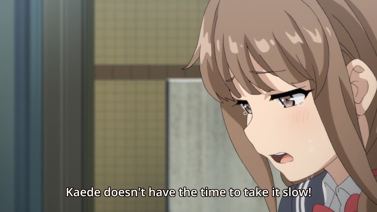 — Arguably, Kaede has the most well-grounded trauma of all of the girls thus far. She’s suffering from a problem that I could easily imagine happening to a lot of people. On the other hand, Mai’s issue was a very special case. Most of us aren’t celebrities. As for Tomoe, she selfishly trapped Sakuta in a time loop just because she didn’t know how to turn a guy down without jeopardizing her shallow friendships. Rio divided herself into two over a crush. Compared to Kaede, these just feel silly. On paper, the girl faces an issue that feels more real and pertinent. So why do I still find it so difficult to empathize with her?