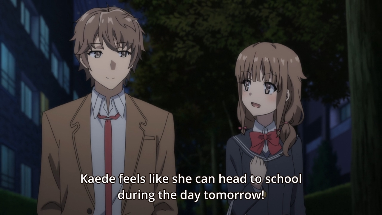 — Sakuta wraps up the flashback by telling us that although he wants Kaede to recover her lost memories, he’s worried what this would do to the current Kaede. Shrug, she can just combine the two? Neither persona needs to be lost forever.