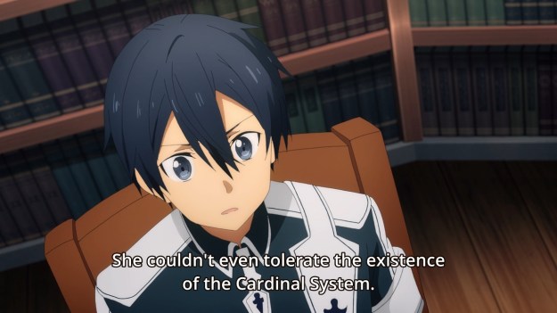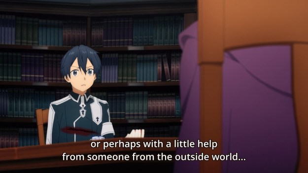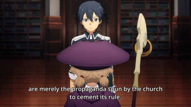 — So it’s 2v1, but Kirito and Eugeo still get their butts kicked. That’s when Eugeo remembers that this guy used to be the top swordsman of a place I don’t give a damn about (it’s not even real). They just grab people with great potential, erase their identities, and brainwash them into becoming Integrity Knights. For what purpose? Shrug. We’ll find out later, I’m sure.