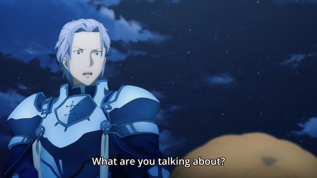 — Eugeo and Kirito continue to try and revive Eldrie’s memories, but out of nowhere, an arrow strikes Kirito in the foot. Our heroes look up to see… well, wouldja look at that? A guy clad in heavy armor from head to toe, so we have no clue who he is!