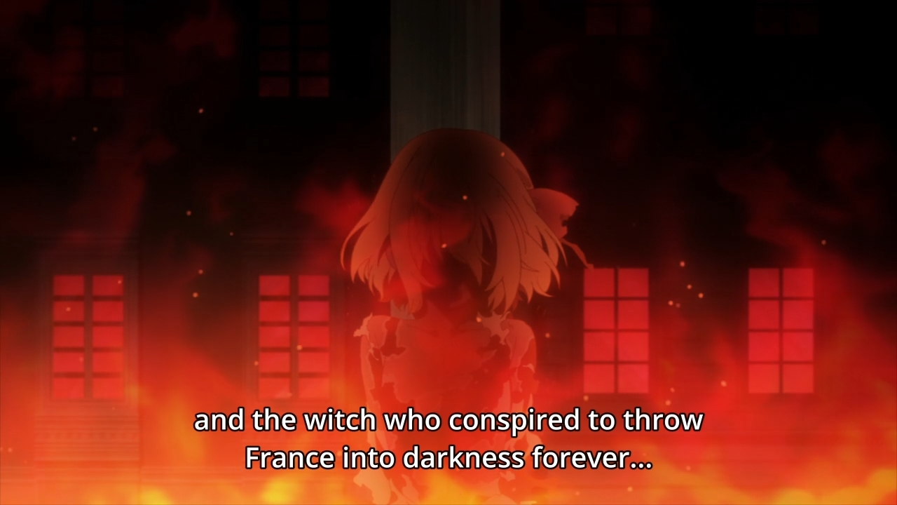 — Right after the OP, we see once again that Jeanne will be burned at the stake in some distant future. Maybe not this future, but y’know, multiple timelines and all that jazz. Still, this is enough to spook Montmorency. Maybe he doesn’t think that the world is worth saving anymore, because his precious loli saint will be vilified by the very people she’s trying to save.