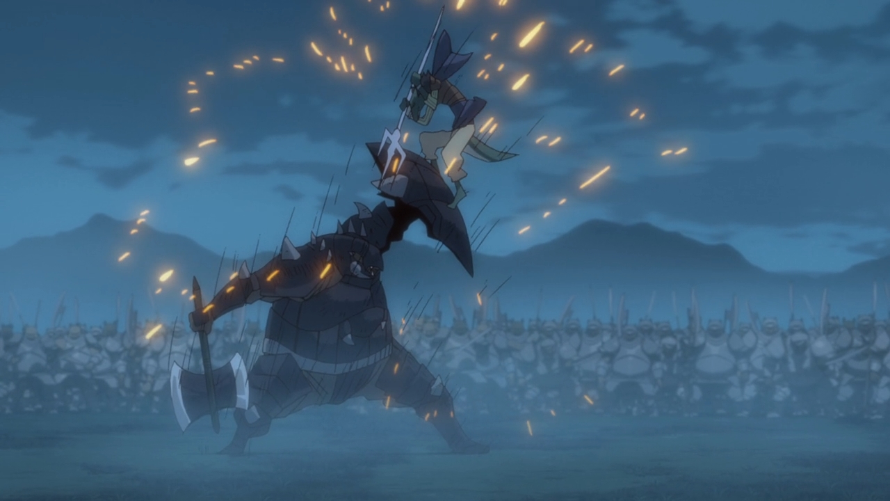— Anyways, we’re back to Gabiru, and predictably enough, he’s unable to get through the orc general’s defenses. One guy is clad from head to toe in heavy armor. He even carries a giant shield. The other guy only has a flimsy spear. I wonder if Gobta can beat this orc, though. Maybe…