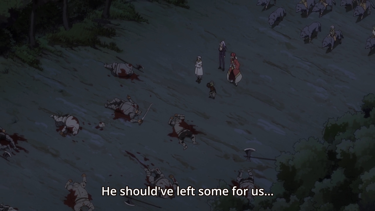 — When the orc general insults Ranga, it’s now time for the doggie to flex his muscles. And even then, he’s only using a fraction of his powers. Ah well, everyone’s just taking turns stunting on the pigs. The criticism from earlier isn’t just limited to Rimuru and Rimuru alone. Is it really that enjoyable to watch high levels stomp low levels with impunity? Personally, it’s kinda boring to me. Maybe this is why I don’t find ganking in MMOs to be all that fun. It’s also the same reason why Overlord never drew me in. Watching the good guys laugh their way to victory is boring. Watching anyone laugh their way to victory is boring. The only good thing here is that Rimuru isn’t a soulless bastard like Ainz.