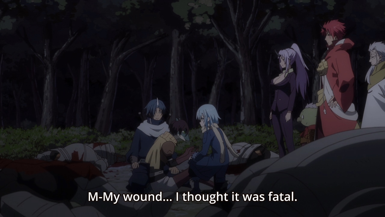 — The lizardwoman was near death, but of course, Rimuru can heal her right up with his potions. Barring special cases like Shizue, he can pretty much save anybody like some kind of Slime Jesus. It just feels cheap. Not only that, the strawman arguments in reaction to any criticism leveled at this show are silly. Just because I want to see Rimuru under a little pressure and earn his victories doesn’t mean I want this to devolve into another shounen anime. Why is it so hard to understand that it can a little boring for some people when the main character can do almost everything with ease? If you like that sort of thing, fine. It doesn’t mean that I have to do the same.
