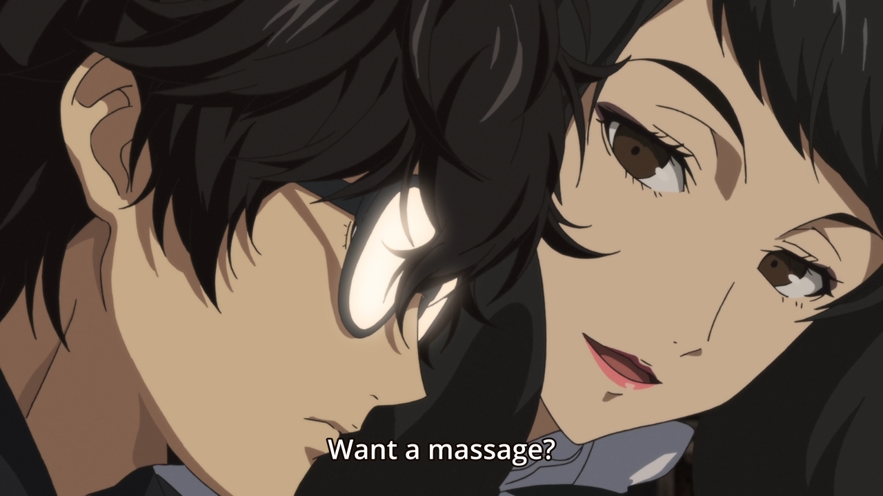 — So everything that we’ve seen so far — or played so far — is from the perspective of Ren’s working memories. That’s why you didn’t know that the team had cased out Sae’s palace beforehand. You can hand-wave this off by claiming that the drugs had screwed with the guy’s memories, and as a result, he couldn’t tell Sae about every single little detail. But in the game, if you end up romancing Kawakami, it’s just weird that you would tell a prosecutor all about how you’ve been soliciting the services of your homeroom teacher. Sure, I guess we can pretend that it’s strictly a maid service and she isn’t totally a prostitute. Alas, we don’t see any of this in the adaptation, because y’know, no romance options for anime Ren. Well, there’s the possibility that he could just plain withhold some details. Y’know, maybe he did smash Sae’s sister, but anime Ren’s just smart enough not to bring it up.