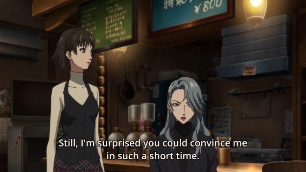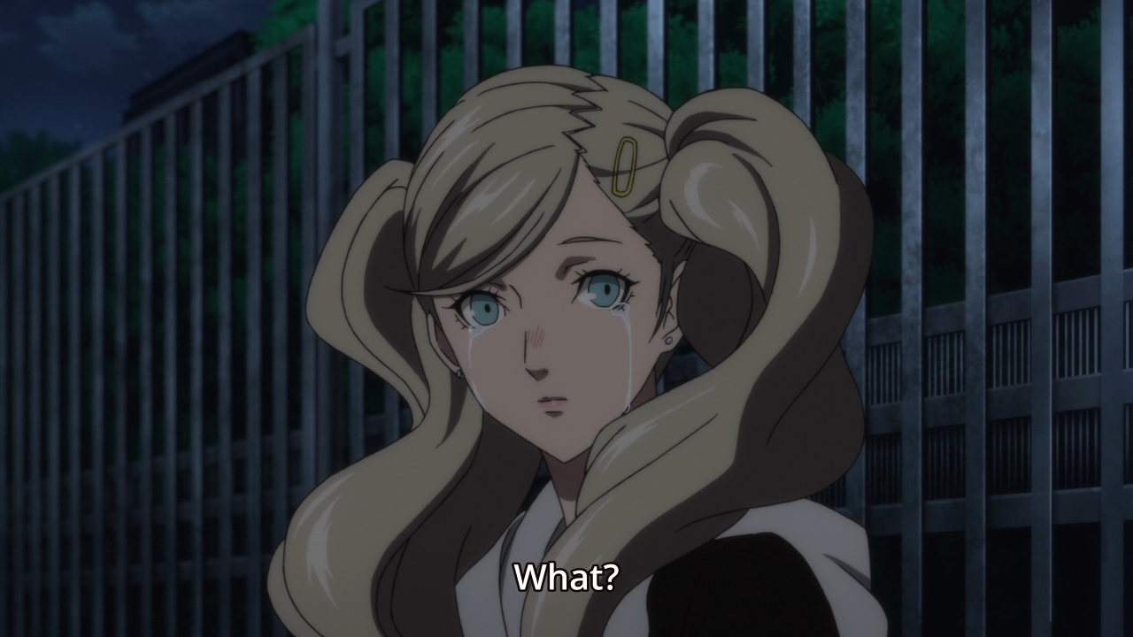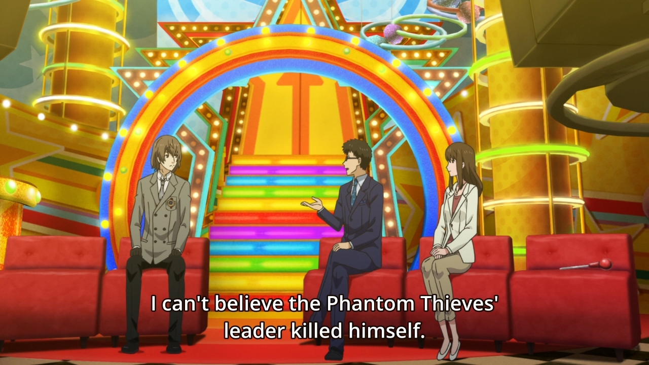 — For those who have played the game, this part is probably odd: we immediately see Sae supporting a battered Ren back to Leblanc. In the game, after Ren’s friends see the news report about his supposed death, Ryuji smiles and goes, “We got ’em.” Why leave that out in the adaptation?