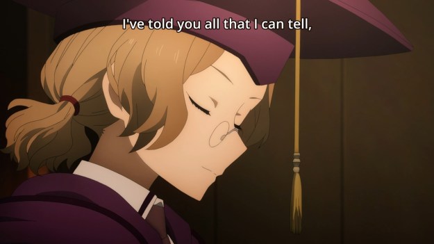 The two of them finally return to speak with Eugeo, and Cardinal promptly inform the blond kid on how to undo the synthesis dealio: just remove the triangular prism and put the missing memory fragment back in its place. I just love it. We go from two people sitting and a room and chatting to three people standing in a room and chatting. This must have been a super cheap episode to produce. The gall of this storytelling format, though. Seriously. Two straight episodes of just non-stop exposition. Look, the bottom line is that the team will have to raid Quinella’s bedroom. But this story is painfully unoriginal, so we have yet another 100 floors to climb. Kirito might be dismayed and thus indicate that the author is somewhat self-aware, but that changes nothing.