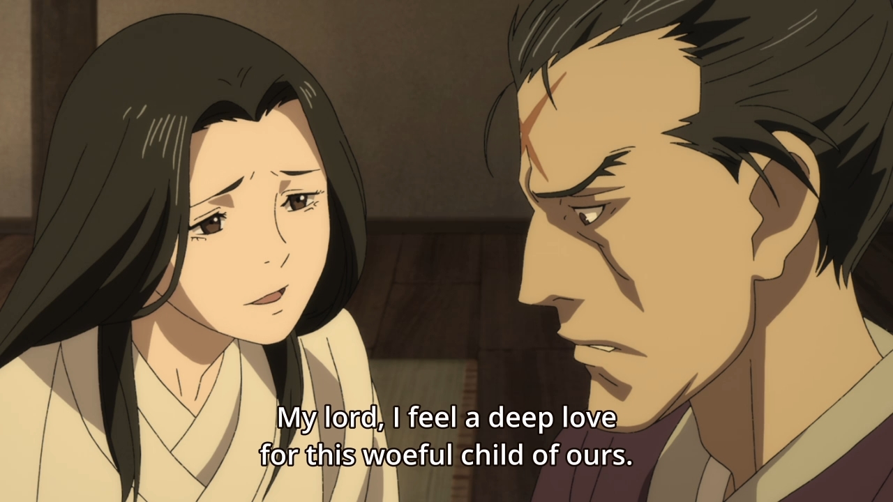 Dororo‘s premise sounds really cool on paper, but I don’t know if MAPPA has the chops to pull it off. In a war-torn Japan, Lord Kagemitsu makes a deal with a “devil”… several “devils,” actually. I’m told that there are ultimately 12 demons (48 in the manga?) to contend with. In exchange for power and wealth, he will give them anything. At first, it sounds like he wants to save his famine and disease-stricken land, but it quickly becomes apparent that he only cares for himself. So when his wife is about to give birth to their (presumably) first son, the servants recoil in terror when they see that the child is born without… well, practically everything that a young, healthy boy should have. No limbs, no eyes, no nose, so on and so forth. The demons left almost nothing behind. They even took his skin. I can only imagine that they left his brain intact. I mean, that’s gotta be the case, right? We are told that a statue sacrificed itself to protect the kid, so maybe this is the only reason why the boy even has his brain or whatever. Nevertheless, Lord Kagemitsu doesn’t feel an ounce of remorse for dooming his own flesh and blood. He literally orders his servants to toss the child, then tells his wife — a woman who has just given birth and still wants to care for her own son — that she better prepare herself to get pregnant again. This man is clearly a sociopath.