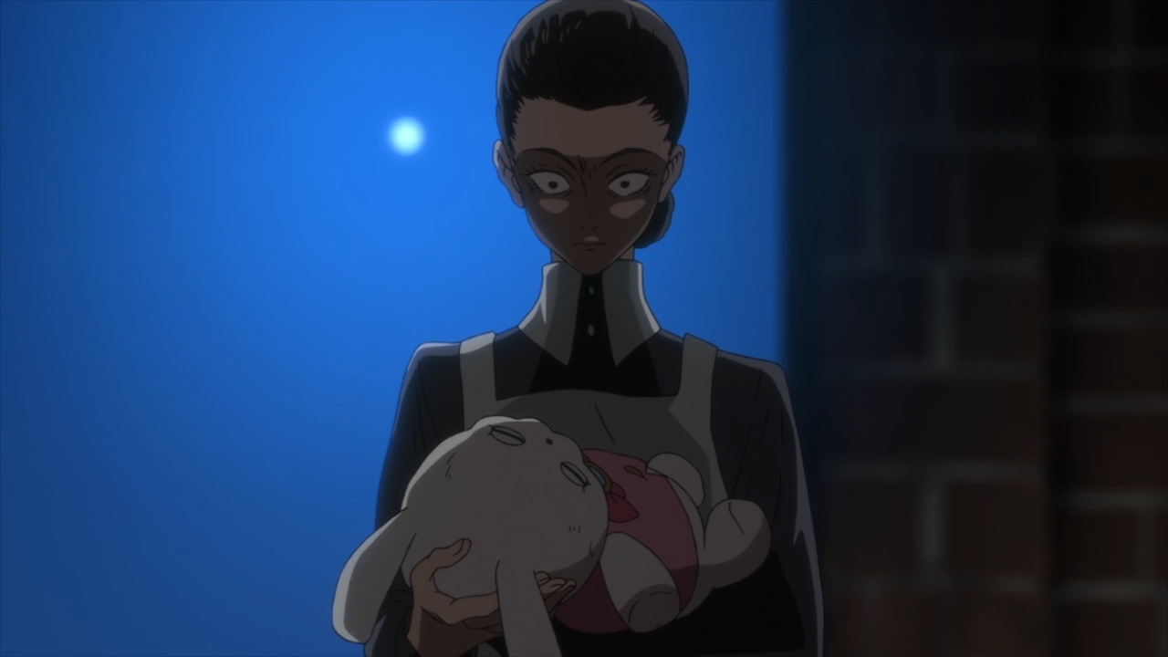 Okay, okay. Enough jokes. Not only do Emma and Norman realize that they’re basically just farm animals, their beloved Mama is working with the monsters. The woman they unquestionably trusted is actually raising them to be eaten. Emma and Norman eventually manage to slip away without being noticed, but they left Conny’s bunny behind. As a result, both Mama and the monsters know that someone knows more than they should. Just look at the woman in this screenshot right before the credits roll. Mama’s gonna punish some naughty children. But right before she had to take Conny away, we saw her take down a precious picture that the girl had drawn. She then hugged the picture as if it meant something to her. She hugged it as if Conny meant something to her. Is this just an act? I dunno about that. I mean, nobody was looking so why would Mama need to keep up appearances? Maybe a small part of her does care for these children. Maybe. But at the end of the day, it’s a monster-eat-human world out there, and you gotta protect yourself.