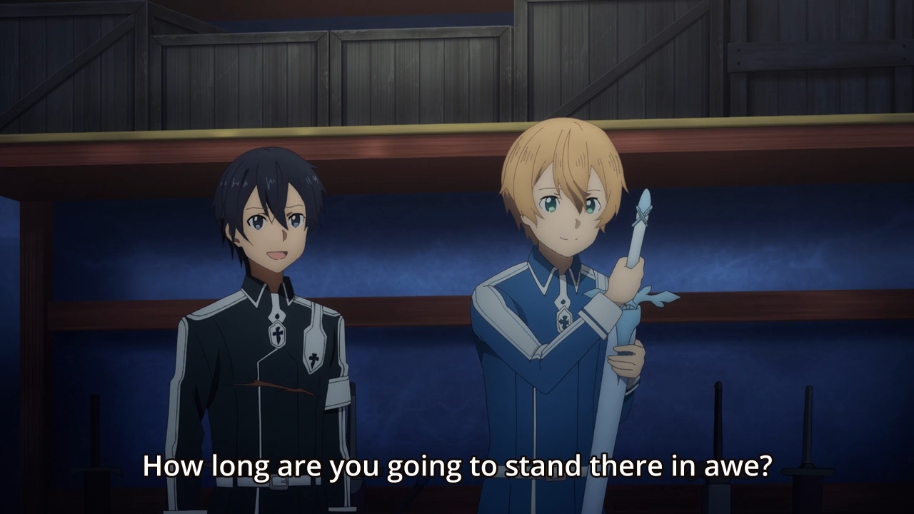 And this is why I think Eugeo kinda sucks. Kirito had to tell him episodes ago that following the rules isn’t always the right thing to do. And now, we see that he doesn’t really have much a moral code if he isn’t already supplied with one. You get the feeling that maybe the author wants to give Eugeo a dark side. Up until now, he’s been such a polite, soft-spoken boy, but when his love for Alice is tested, that’s when he really turns nasty! Oooh, what a contrast! I just find the whole thing funny. First, good luck winning Alice’s heart with Kirito around. Second, what is killing Deusolbert even supposed to accomplish? Will it really make the kid feel better? Will he able to sleep soundly at night knowing that he murdered a soldier in cold blood? The punishment doesn’t fit the crime anyways. Alice broke a law, so she got “arrested.” Was the law she broke stupid? Yeah. Is it also bad to brainwash her? Sure, but Deusolbert didn’t do that. I’m not saying that Deusolbert didn’t do anything bad, but are his crimes serious enough to be executed?