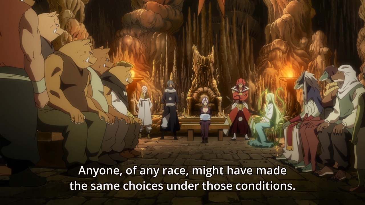 Rimuru could individually fart in everyone’s meals and they would thank him for blessing them with his grace. So what else is new? Well, there’s a new OP and ED if you care about that sort of thing. I don’t, so I skipped them. Rimuru’s first post-war (was more like a single battle than a full-fledged war) decision is to not charge the remaining orcs with a crime. Look, I done the same. I totally agree that it’s more prudent to recruit the orcs and have them under your fold. Enacting a harsh penalty would’ve just bred resentment and hatred. And who knows? Said resentment and hatred might have led to another war. So yeah, go ahead and turn the orcs into allies. I just hate the slime’s reasoning. I’m sorry, but’s a load of crap. You don’t invade and literally eat other nations, because you’re suffering from starvation. Animals do that. As far as I know, these races might be considered monsters, but they’re not animals.