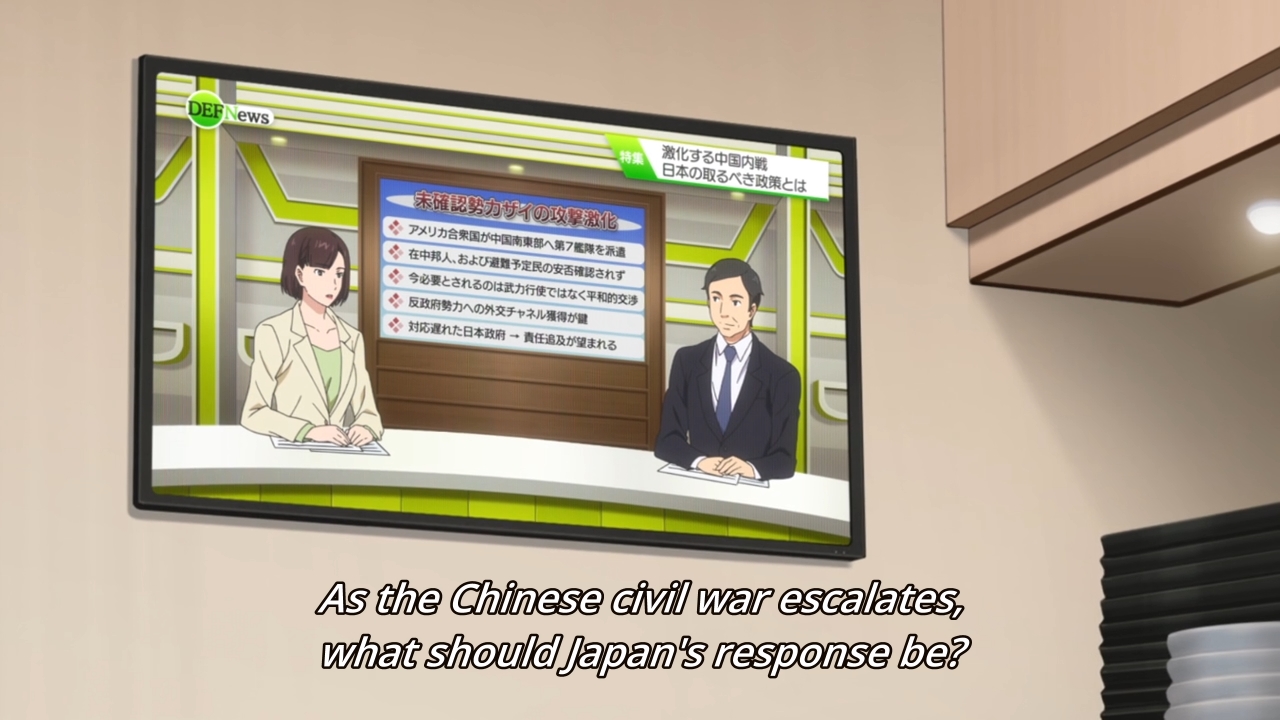 So I guess it’s now time to discuss the Xi and what little we know about them. I’m not expecting a full blown dissertation on the antagonists and their modus operandi, but give me something, right? After two episodes, I should kinda know what I’m up against, right? At the moment, I know that the fighting takes place in and around China. This week’s episode only throws in the extra tidbit that the (presumably) Korean Peninsula and the island of Taiwan are also involved. I also know that the Xi fly special fighters that normal humans in normal fighters can’t hope to compete with. As a result, brilliant minds like Yashiodoori have developed a countermeasure like Gripen. But beyond this, I know nothing else about the Xi. Nothing at all. Nothing about their overall aims, nothing about what they actually look like, etc. Our only real clue is that the Japanese media refers to this conflict as a civil war in China. Okay then. As a quick aside, I found it extremely amusing when Kei took huge offense at one of the newscasters daring to suggest that they should try and have a sit-down with the Xi in order to discuss a peaceful resolution. Rawr, we must fight! Rawr, Japan must be ready to deal with any situation that arises in East Asia!