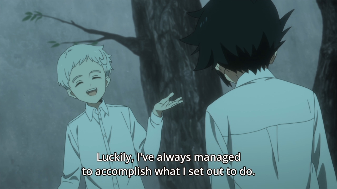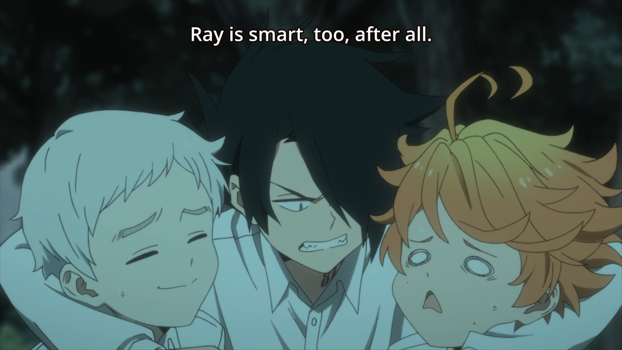 After realizing that he can’t convince Emma that they should prioritize just the three of them, Ray tries to work on Norman instead. Surely, the latter will listen to reason over emotions, right? Well, they’re getting to be that age where things start to change. Plus, Norman is so cocksure of himself that he just comes right out and admits it: he’s in love with Emma. And as such, he’s going to do everything in his power to make sure Emma never cries again. He even reveals that he’s ashamed of himself for not being as caring and compassionate as the girl. Nevertheless, he knows he’ll succeed, ’cause hey, he’s Norman! Arrogant, lil’ bastard, huh? But hey, if he’s never failed, then he has no reason to lack confidence. He has no reason to be unsure of himself. There are moments, however, where I’m not keen on our trio being comprised of a bunch of super capable geniuses. Being smart is one thing, but Norman apparently knows how to pick locks. Is that a skill that you just automatically acquire with a high IQ? So of course, this leaves me a bit wary of future plot developments. At one point, Emma is concerned that there might be listening devices or cameras hidden throughout the orphanage. Norman simply replies to her that he had already gone and looked for them. This is the sort of thing that I don’t want to see. I don’t want actual, legitimate concerns being brushed aside so easily because super genius Norman had already thought to take care of them.