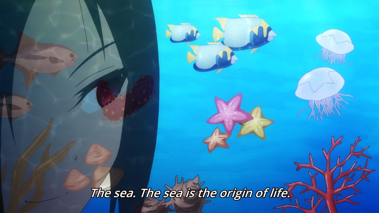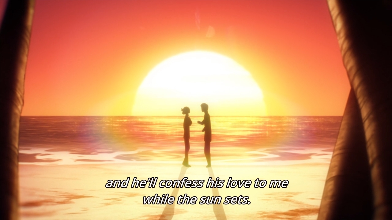 — Unfortunately, his rival has other ideas. She’d rather try and seduce him in a bathing suit, so visiting the sea is her choice. She also adds something about the ocean being the origin of life. I mean, she’s not wrong, but I’m not sure where the romance comes into play here. It’s obvious, of course, that these two are rather clueless about love and dating in general.