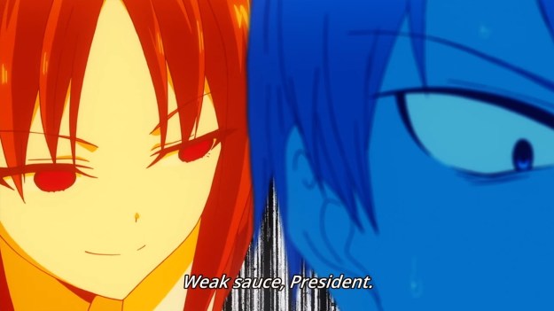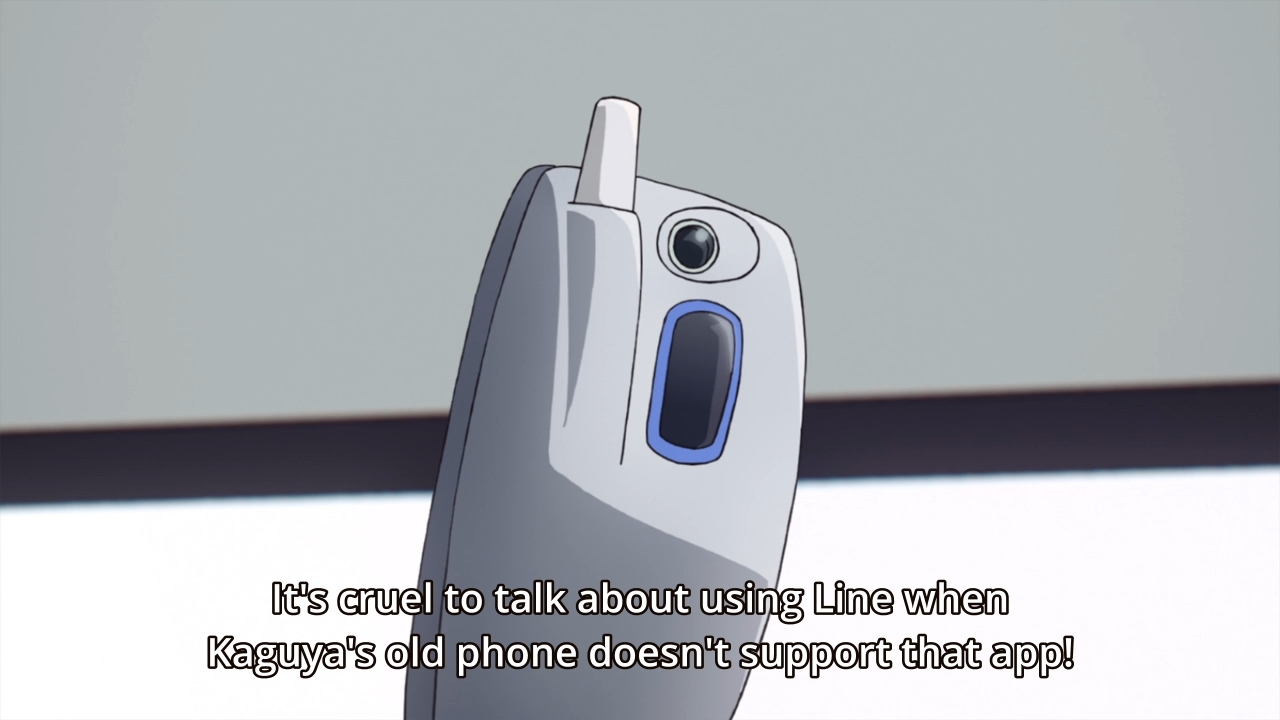 — Once again, Chika serves as the semi-clueless ditz who pretty much exists only to make sure no one takes a huge loss in this unending mating dance between her two friends. The guy throws the first punch, but Kaguya’s riposte is super effective. But although it may seem as though the girl has gotten an upper-hand on Miyuki, Chika plays her role perfectly. As a result, she quickly reminds them both that despite Kaguya’s wealth, she has an old flip phone that can’t even use LINE. How quaint.