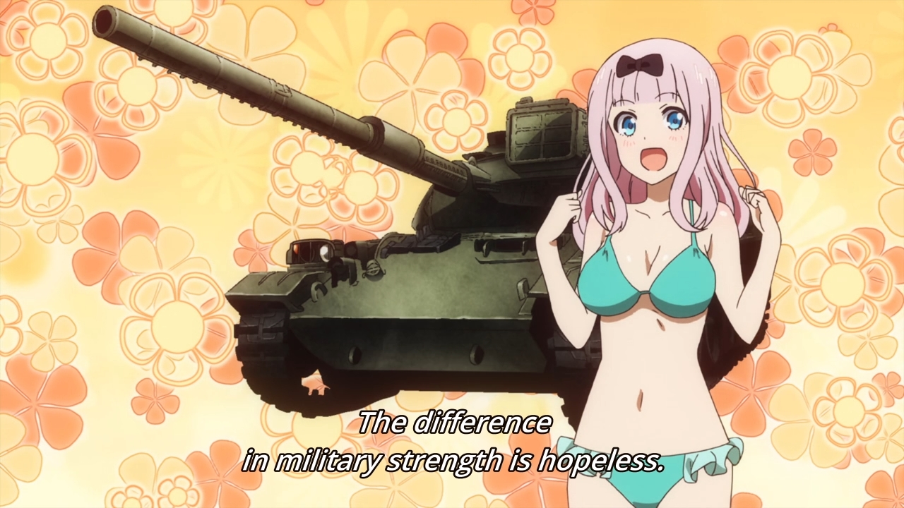 — Here comes Chika to level the playing field! If they’re headed for the sea, the girl innocently remarks that she’ll have to buy a new bathing suit. This reminds Kaguya of the great disparity between their assets, and as a result, she completely flip-flops and would rather head to the mountains instead. I dunno, bigger isn’t always better.