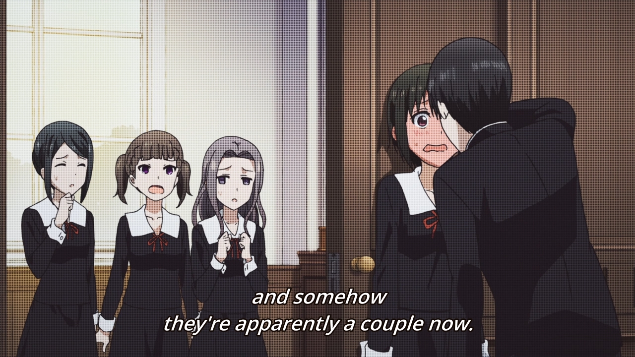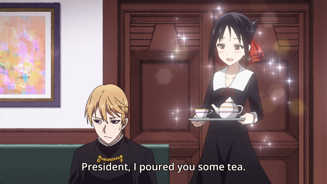 — The guy eventually notices Kaguya trying to hide behind the door, so he starts singing her praises instead. It isn’t a love confession, but we see later that there’s a ceasefire in the war for now. He also turns it around and ends up giving the other guy some decent advice. Too bad he can’t recognize the irony. Still, let’s hope that this actually leads to something worthwhile in next week’s episode, but I wouldn’t be surprised if we go back to more amusing but ultimately inconsequential short stories.