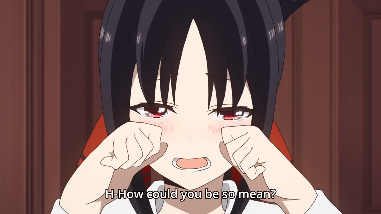 — Kaguya just happens to be nearby, so of course, she’s going to listen in on this conversation. At one point, things almost get interesting when Miyuki shows a bit of vulnerability: he sometimes wonder if his love interest actually hates him instead.