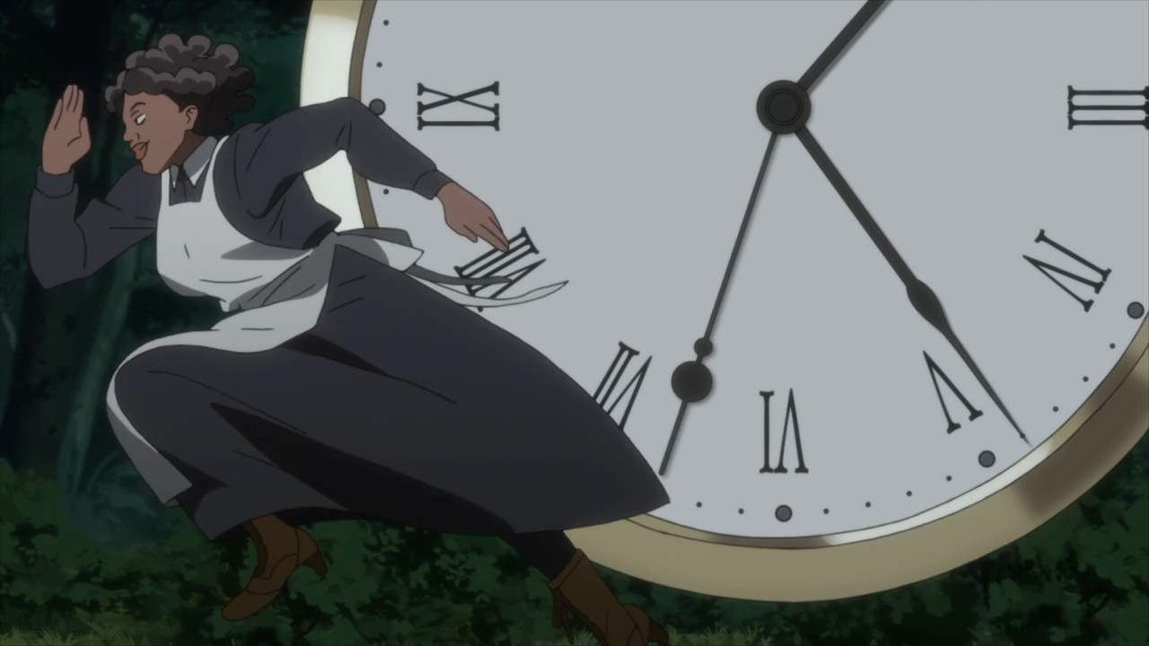 In the end, Krone has no problem tagging everyone except for our two boy geniuses, so I guess she now knows what she’s up against. At the moment, I can’t tell if Krone is cunning or not. When she was chasing after Emma, she listed off the trio’s weaknesses. She was letting Emma know that she had read up on all of the children and studied them inside-out. If push comes to shove, she would know how to handle them… in theory. For example, Emma’s weakness is her naivete. So then what does Krone do? She follows this up by telling the girl that if she knew about the harvest from the first episode — i.e. Conny’s death — then the woman would be on her side. Um, okay. Hey, you’re weak to scams. Know that. Know that I know that. By the way, would you like to buy some essential oils? Again, I dunno. Maybe this some sort of brilliant mental manipulation that I’m not aware of.