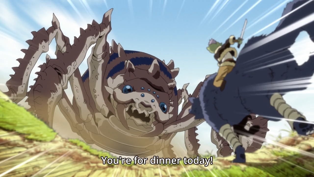 — Afterwards, we meet yet another new face: Youm. He and his gang are here to investigate the Orc Lord, and along the way, they bump into Fuze and his three idiot adventurers. They are about to face off against a knight spider when Gobta shows up and defeats the giant monster singlehandedly. Basically, anyone who is important in Tempest is super strong. Even Gobta could be a hero now in his own right. We should do a spinoff series.