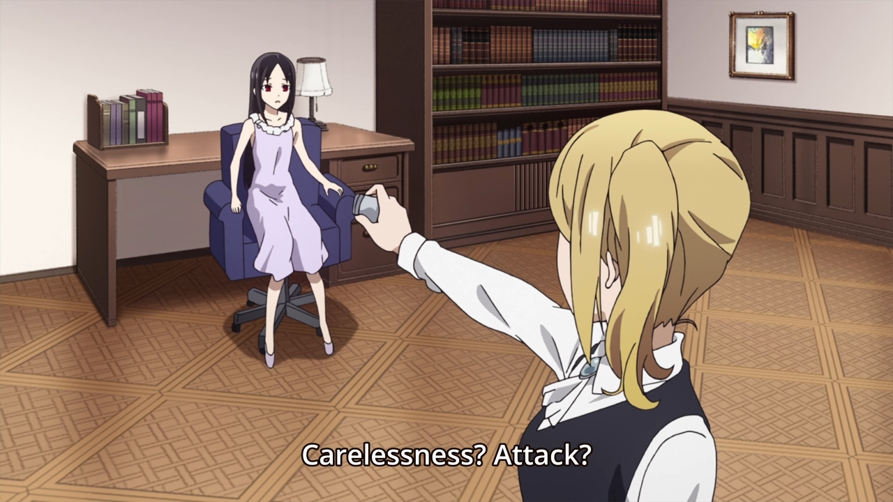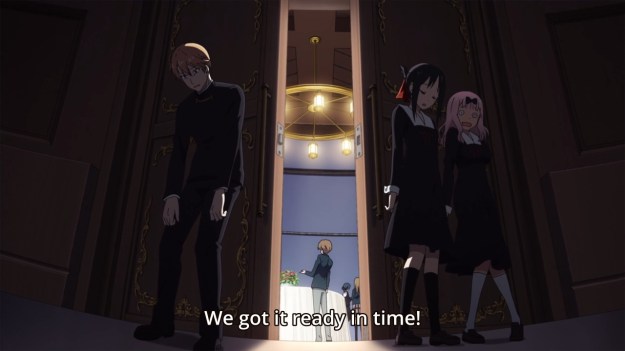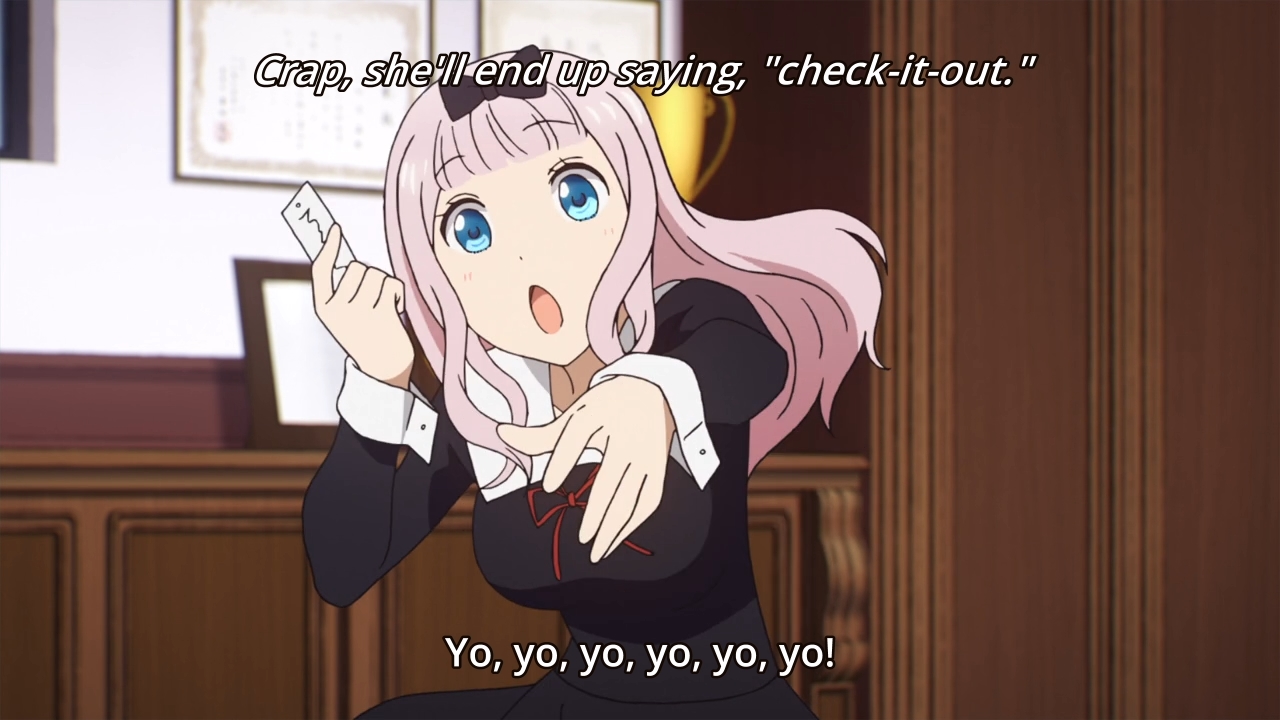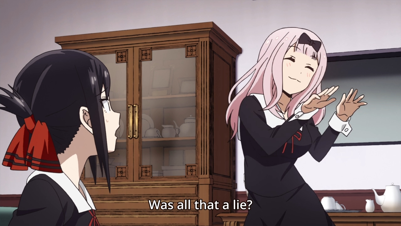 Two volunteers need to shop for the upcoming party, but there are three of them! Miyuki acts as though it would be such a bother, but obviously, who wouldn’t want to spend an entire day with their crush? As a result, the three of them play a game. The winner won’t have to go shopping, but in this case, the losers actually want to lose. Chika suggests that they play the banned word game, which is not something I’ve ever heard of up until now. Nevertheless, it’s pretty straightforward, and interestingly enough, the normally air-headed secretary appears to be super ruthless when she plays this game. Chika actually uses one of her insecurities to instantly eliminate Kaguya. She just knew that her friend would try to comfort her and thus use the word “love.” Miyuki then changes plans and wants to win, but it’s in his nature to sound like a generic anime character. As a result, he goes down just as fast as Kaguya. No wonder Chika suggested this game, huh? Again, she’s ruthless at it… ruthless and silly. I swear like this entire show is just full of “gifable” moments of Chika. Come for the romance that never goes anywhere, leave with a wheelbarrow full of potential Chika memes and dances. Anyways… we don’t even get an inch here. But this does naturally segue into…