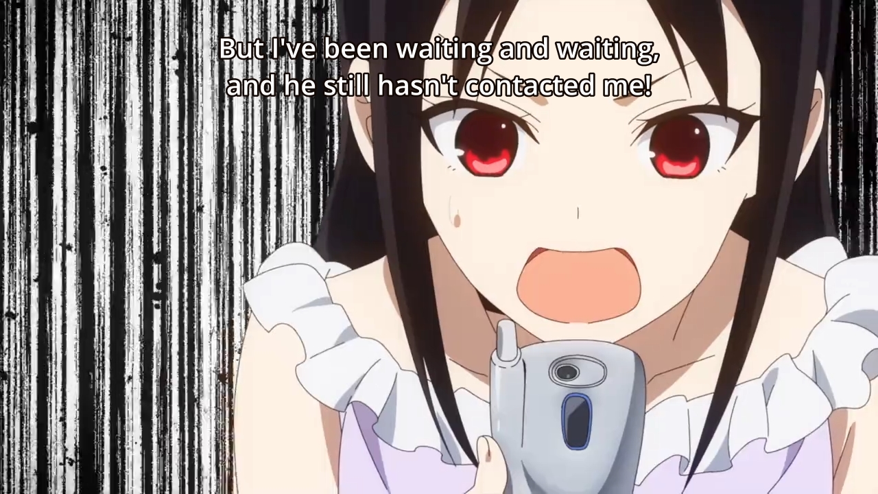 So the plans get confirmed, and Miyuki says, “I’ll see you tomorrow.” That usually signals the end of a phone call, so I can’t blame Kaguya for hanging up on the guy. I do find it odd, however, that she didn’t say bye or whatever. You usually do that, don’t you? Either way, the guy was about to say something else, but since she hung up on him, she gets to scream into her pillow in frustration instead. Luckily, Miyuki texts her what he was going to say anyways. Why not just call her back? Shrug. But if you look on the bright side, Kaguya gets the first text that she wanted so badly, and they confirmed their plans for tomorrow. Win-win, right? We get to watch these two lovebirds hang out all day right? Hah, please. This show only gives out inches.