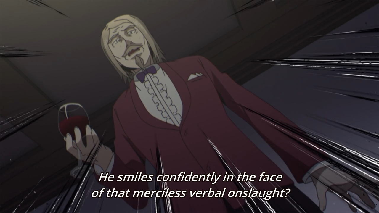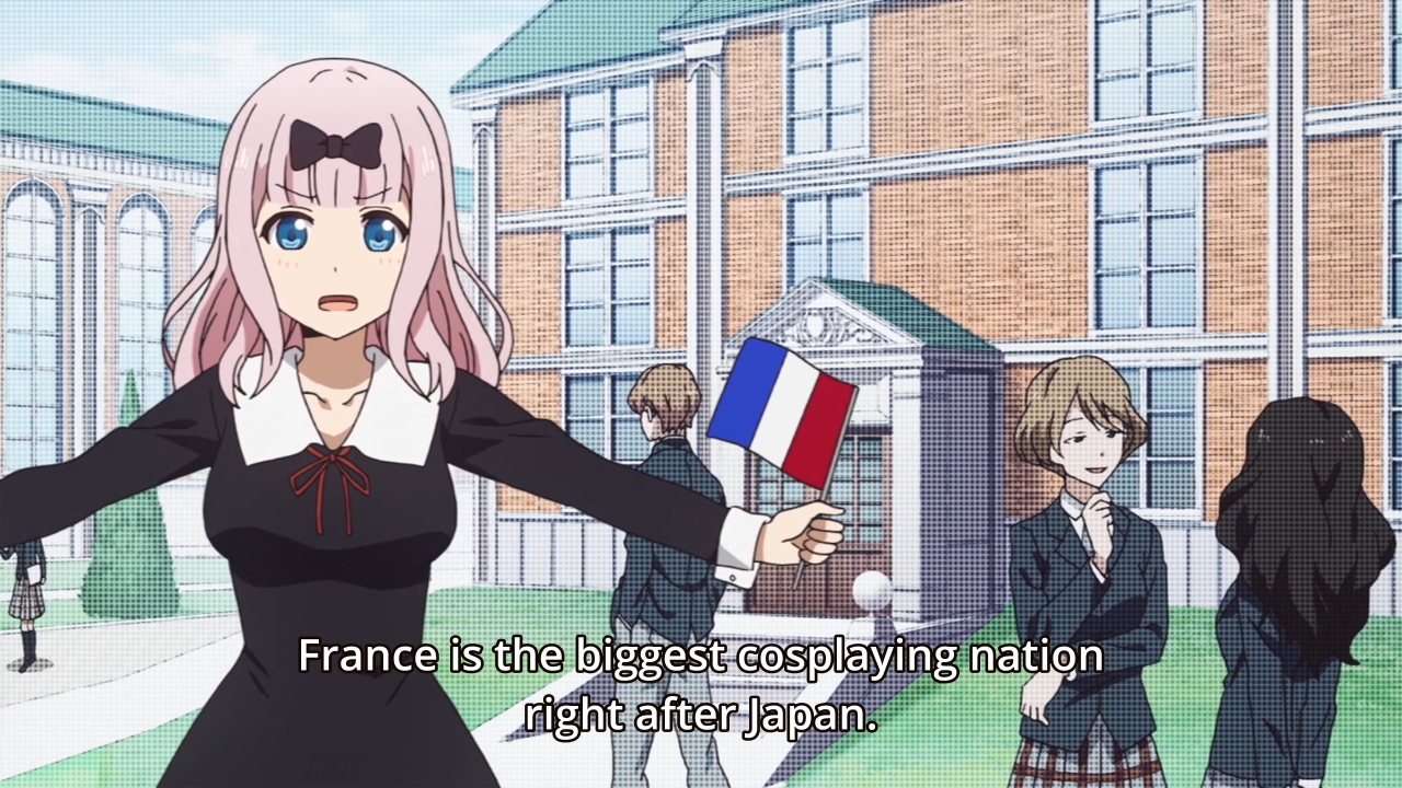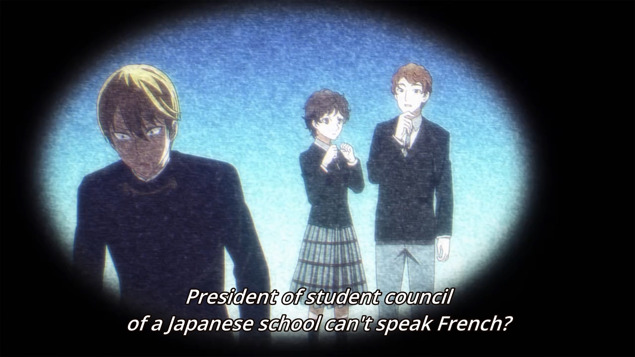 The day of the party has finally arrived, and it’s some sort of joint soiree with a French academy. You know what that means: horribly butchered French pronunciations! I’m not trying to bag on these poor characters either, ’cause every non-French person sounds stupid when they try to speak the language. I But I digress. So what’s the story here? Well, Miyuki tries to impress Kaguya by busting out a few simple French phrases that he picked up from the other school’s handbook. At first, she feigns complete ignorance, but it becomes readily apparent that the rich girl is actually fluent in the language. Japan loves all things French, after all. Her little ruse, however, causes our student council president to worry that everyone will now look down on him, because he can’t participate in any of the conversations around him. Hell, even Chika is fluent in the language. I had no clue that knowing French was a requirement, but again, Japan loves all things French…