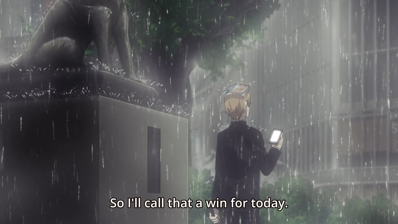 As a result, it is absolutely pouring the next day. Kaguya still wants to brave the storm anyways, but Ai tells the girl that there’s no way that Miyuki could possibly still be waiting for her in front of Hachiko. Well, about that…