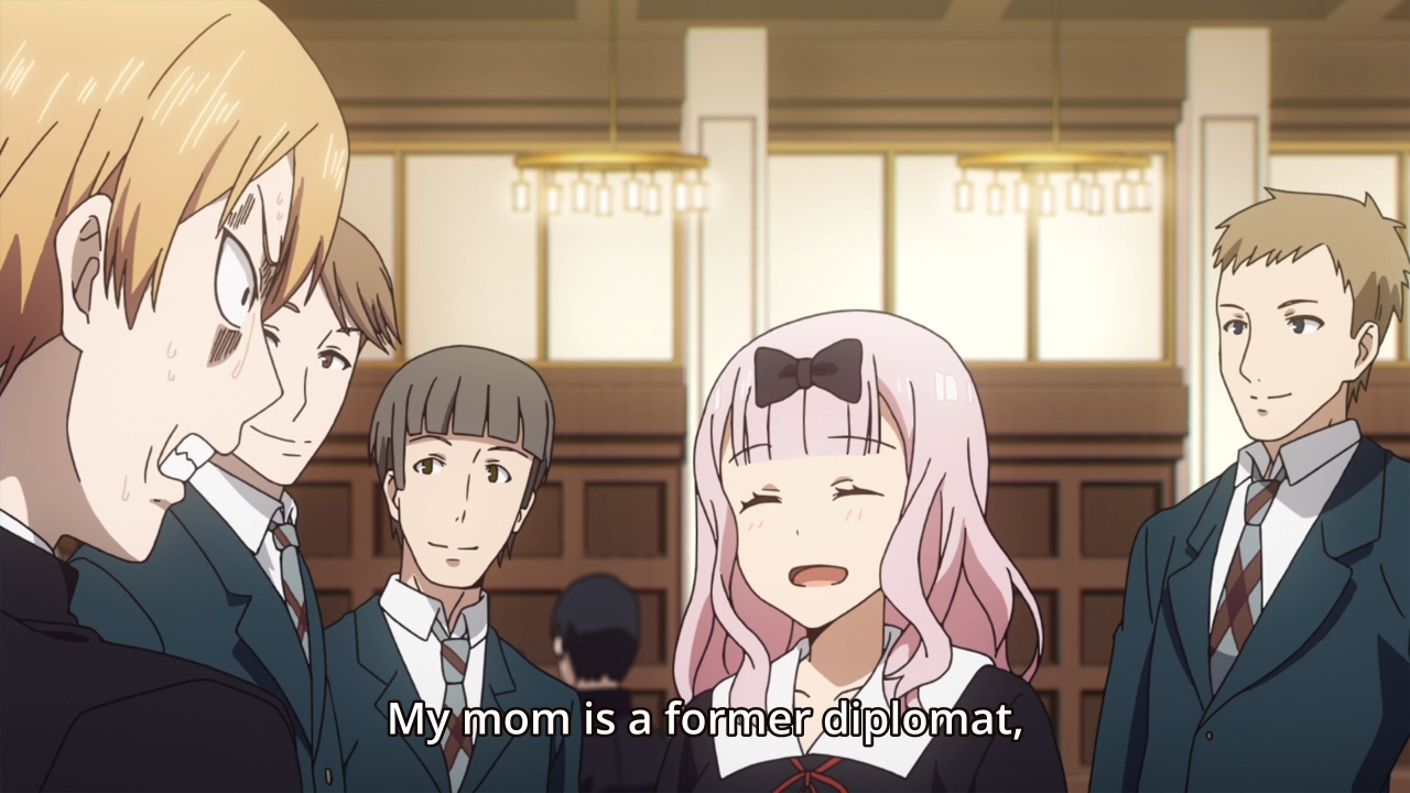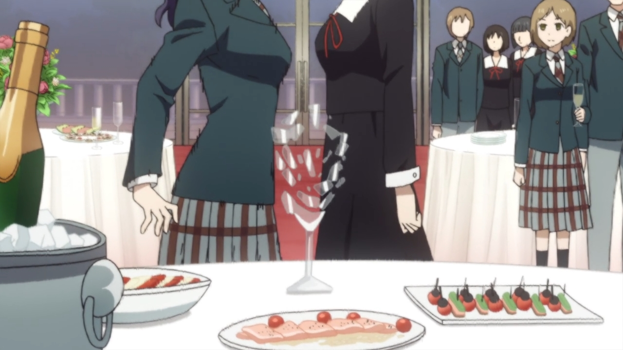 Kaguya. She then unleashes a tirade of her own at the French girl. I’m sure it’s probably gibberish, but let’s assume that she just tore her victim a second asshole. Mmhmm, it’s so vicious that it shatters a nearby glass. Basically, we get to see that our heroine can turn into an overprotective mama bear if anyone goes after her loved ones. In the ensuing aftermath, she worries that Miyuki will lose respect for her because she was so foul-mouthed. Well, he doesn’t understand a damn thing she said anyways (neither do we). Instead, he just thanks her for coming to his defense. Yep, there’s your inch. It’s also the last inch for the week, because the episode is now over.