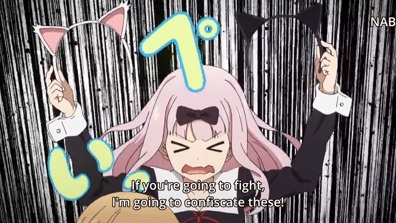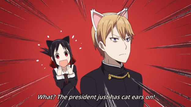 Oddly enough, Kaguya loves the way Miyuki looks with cat ears. So they both desperately want a picture of the other person wearing cat ears, but they also can’t act natural. As a result, Chika is worried that her two friends might start fighting. She ends up snatching the cat ears away and we make no progress. So where’s our inch? Like Oliver Twist, we look up with starving eyes and beg, “Please sir, I want some more…” The anime looks down on us with disdain and slaps this paltry gruel into our bowl: