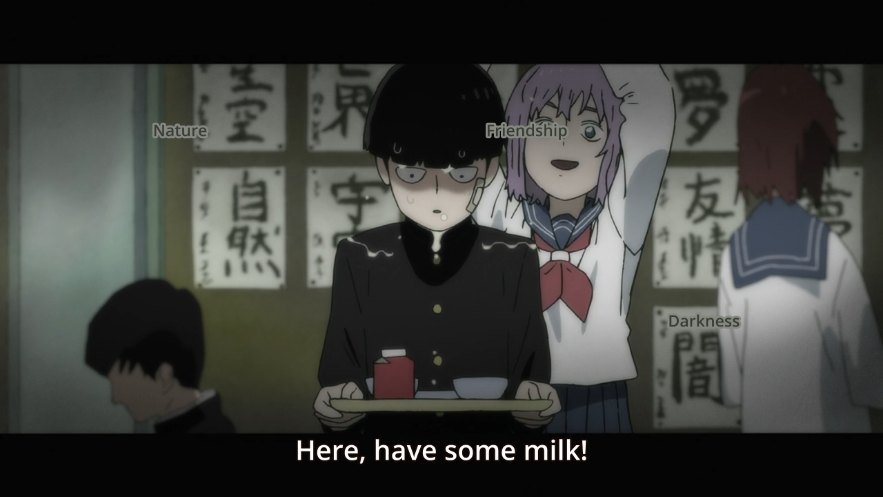 There are two sides to every coin. On the one hand, both the animation and the sound design are killing it. Mob’s battles against Keiji and the congregation of evil spirits are super hype. Can’t really object to much there. But on the other hand, the incessant narration is just killing it for me. As a quick reminder, Keiji robbed Mob of not only his powers but his memories as well. Our hero is then forced to live out his “normal” life in a hypothetical world where he isn’t blessed with both psychic powers and friends. It doesn’t take long, however, for Keiji to inform the audience that, well, this is all just one big illusion to corrupt and break the kid’s spirit. I don’t see why he really needed tell us this. Not only are these scenes displayed in an even wider screen format, which is usually a huge indicator that we’re not in reality, couldn’t we have figured this out on our own? I just feel like this is yet another case where narration treats the audience as if it’s too stupid to follow along with a rather straightforward plot. For instance, Minori also starts bullying Mob shortly after transferring to this school. In case you somehow didn’t realize why bullies are bullies, we are then quickly informed by Keiji that she’s doing this “in order to secure her position in society.” Then when Mob finally snaps out of it (with Dimple and Arataka’s help) and starts fighting back against Keiji, a different narrator chimes in to let us know that our hero is now winning thanks to his positive emotions being at 100%. Again, this is something we could’ve figured out by just watching the episode and paying attention.