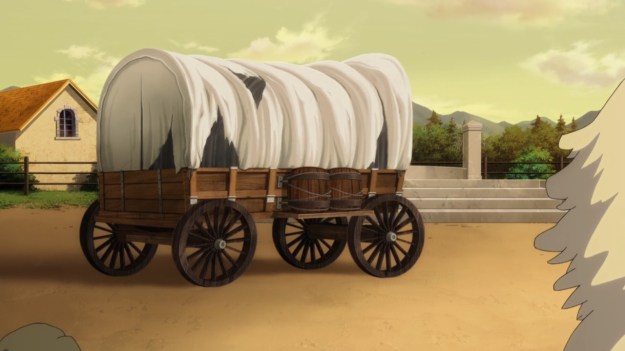 Speaking of wagons, Naofumi gets one as a reward for saving the village once again. This time, from evil socialist taxation.