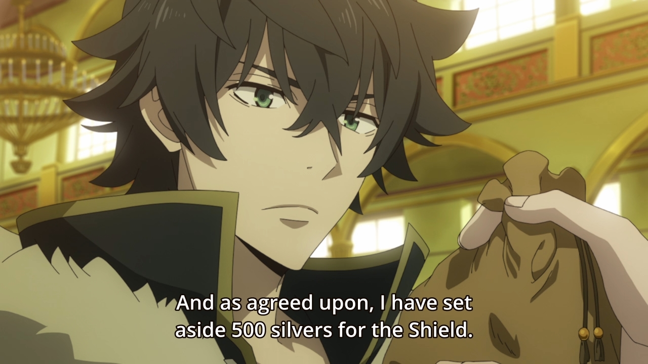 Speaking of the Naofumi, we’re just now getting to the heroes’ reward for dealing with the first Wave. Not surprisingly, he gets a paltry sum that pales in comparison to the other heroes (Spear Jerk gets eight times his amount). To add insult to injury, the king wants to charge him for removing Raphtalia’s slave crest.