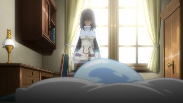 — The next morning, a groggy Rimuru wakes up to see an image of Shizu looking over him. I was hoping for her to start talking to him like the dead ghost of Obi Wan Kenobi giving Luke advice, but no such luck.
