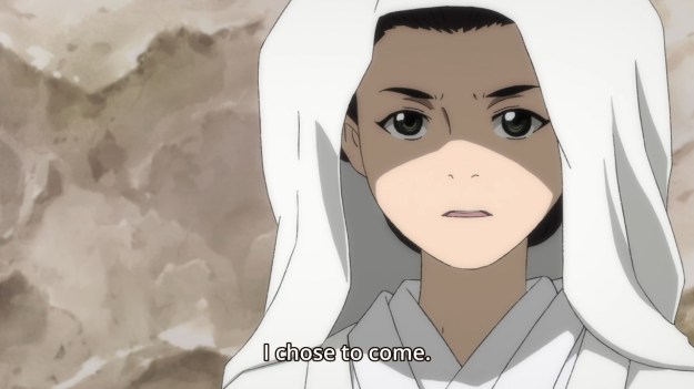 — Dororo sees a bunch of men carrying a sad-looking woman. They’re all dressed in white, which I can only assume is traditional wedding garb from the time. Soon afterwards, this Mononoke-esque kid shows up and starts firing arrows at the wedding party. The woman being sacrificed is supposedly his sister, and he’s not about to let some mean ol’ bug eat his family.