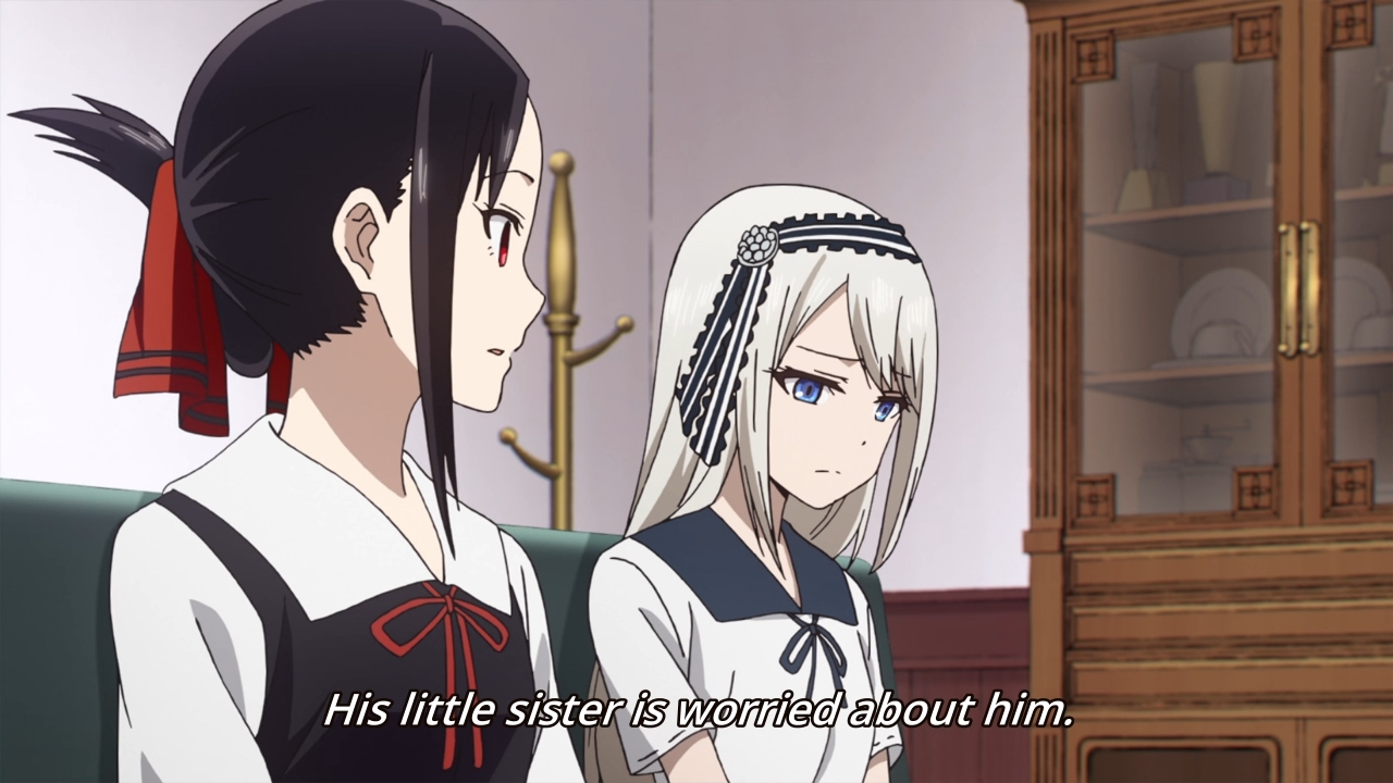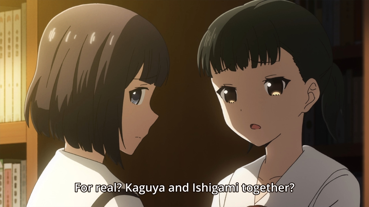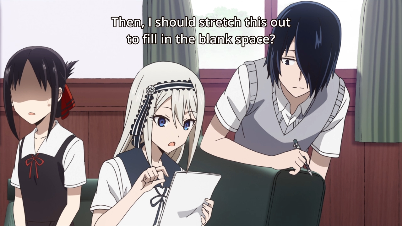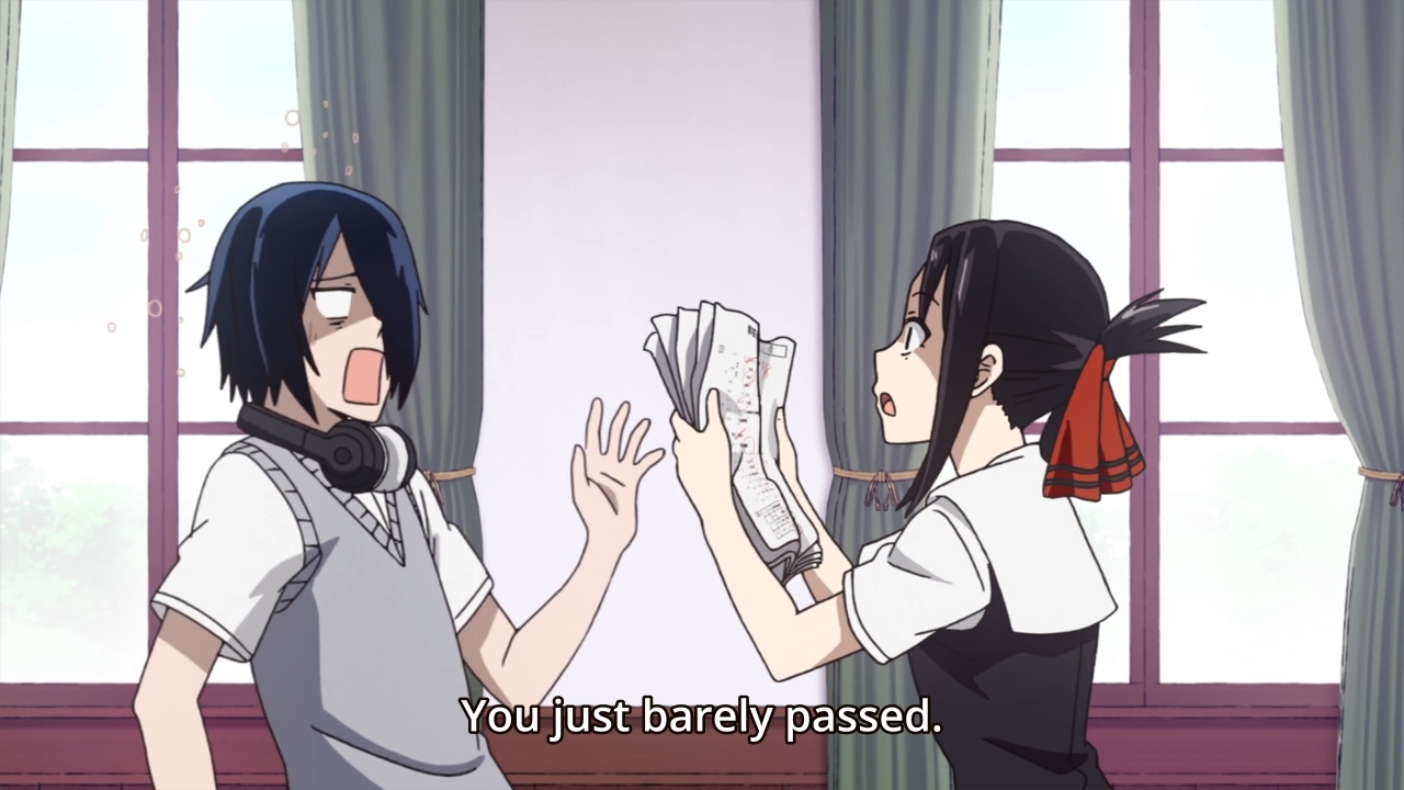 Maybe Kaguya could’ve beaten Miyuki this time if she didn’t feel compelled to help Yu out. The kid is warned that if he fails his exams again, he’ll be held back. I’m surprised they wouldn’t just kick him out. Either way, Kaguya takes it upon herself to force the guy to study against his own wishes. On the one hand, if they lose their treasurer, then this would cause Miyuki some consternation. The girl wouldn’t want that! On the other hand, the story insists that Kaguya has a caring soul, and this proves to be true when she tells off a couple of gossipy students in the library. Japan is portrayed as this super polite country, but man, if you have bad rumors swirling around you, it seems as though people have no problems trashing you out in the open. Still, these moments where we put aside the jokes to focus on the drama are few and far between. The fact that each episode is comprised of three short stories doesn’t help either. The characters have very little room to breathe and grow beyond their assigned archetypes. This is why I don’t really appreciate comedies like this show as much as I would like. It’s not end-to-end laughter like Asobi Asobase, but it also lacks any sort of meaningful character development. I’m left with a mediocre product that I can’t fully embrace. Sure, it’s easy to consume, but I can say that about a lot of things. Macaroni and cheese is comfort food, but it hasn’t got a lot of substance either.