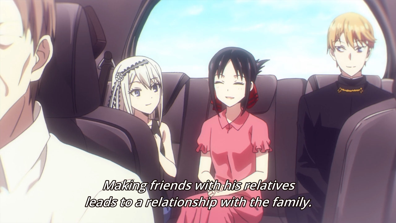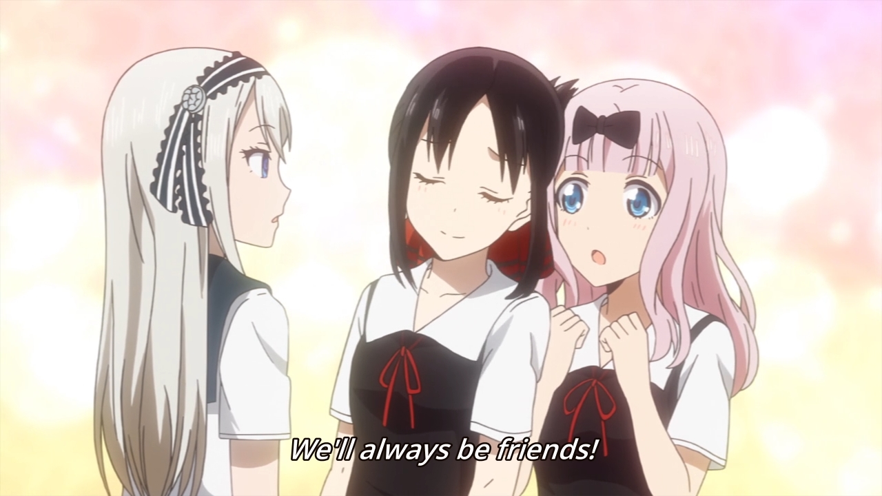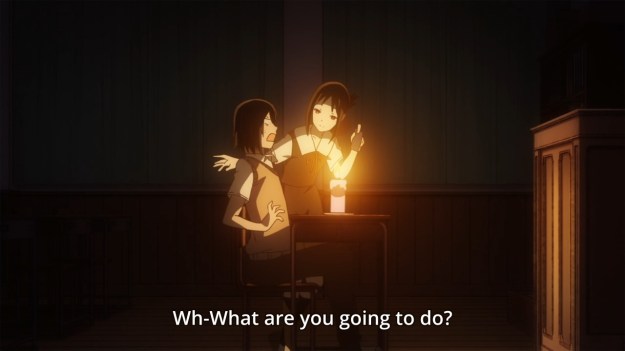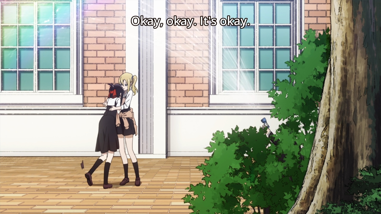 Maybe Kaguya could’ve beaten Miyuki this time if she didn’t feel compelled to help Yu out. The kid is warned that if he fails his exams again, he’ll be held back. I’m surprised they wouldn’t just kick him out. Either way, Kaguya takes it upon herself to force the guy to study against his own wishes. On the one hand, if they lose their treasurer, then this would cause Miyuki some consternation. The girl wouldn’t want that! On the other hand, the story insists that Kaguya has a caring soul, and this proves to be true when she tells off a couple of gossipy students in the library. Japan is portrayed as this super polite country, but man, if you have bad rumors swirling around you, it seems as though people have no problems trashing you out in the open. Still, these moments where we put aside the jokes to focus on the drama are few and far between. The fact that each episode is comprised of three short stories doesn’t help either. The characters have very little room to breathe and grow beyond their assigned archetypes. This is why I don’t really appreciate comedies like this show as much as I would like. It’s not end-to-end laughter like Asobi Asobase, but it also lacks any sort of meaningful character development. I’m left with a mediocre product that I can’t fully embrace. Sure, it’s easy to consume, but I can say that about a lot of things. Macaroni and cheese is comfort food, but it hasn’t got a lot of substance either.