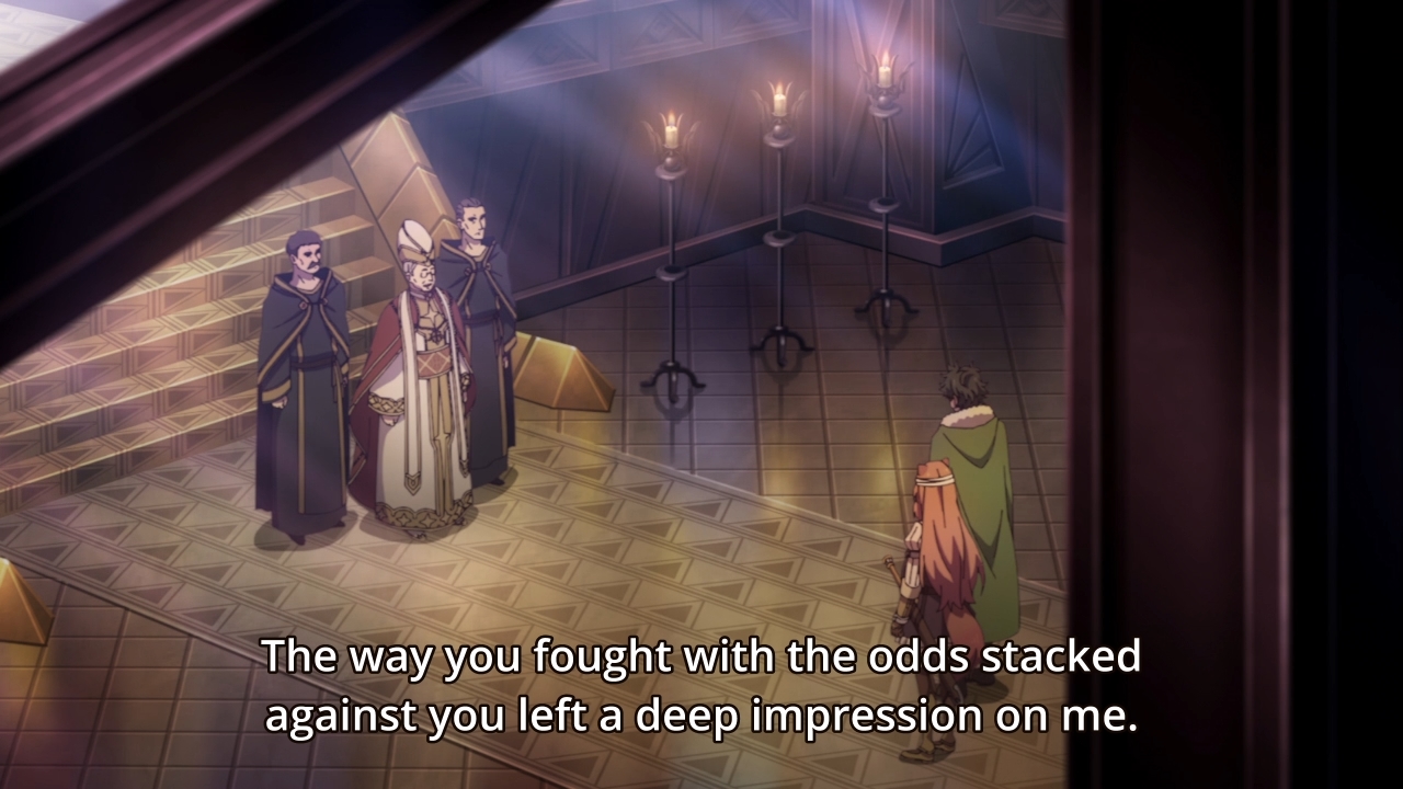 — Eventually, the group makes it back to the capital, and they split off to do different tasks. Filo will accompany Melty for just a little longer while Naofumi tries to procure some holy water for his raccoon girl. This allows us to bump into Mr. Pope Guy. He’s actually being nice to our much maligned protagonist, but c’mon, since when has a top rank religious dude not been evil in an anime? He’ll show his true colors eventually. In the meantime, however, Naofumi gets the holy water he needs for a whopping gold coin, so it’s time to move on.