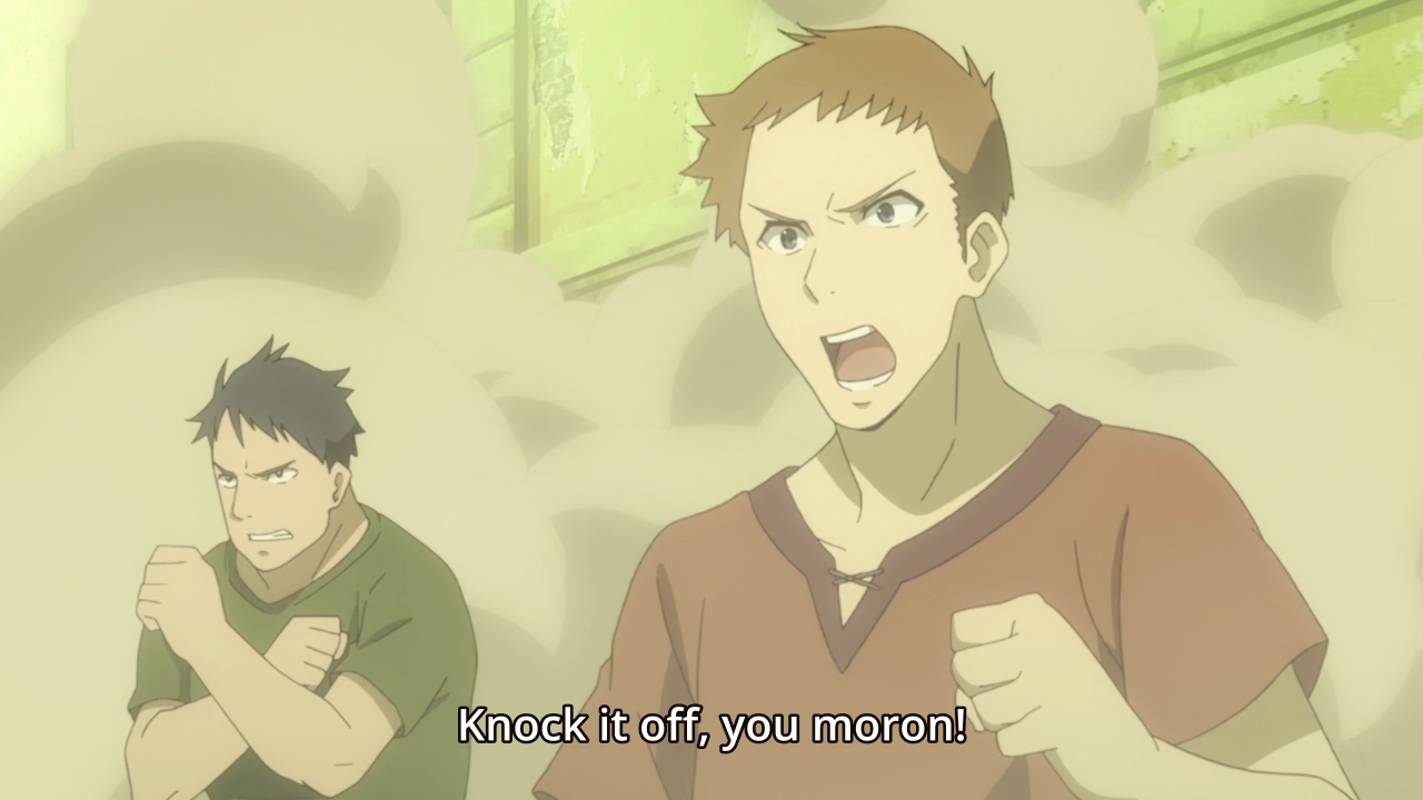 — Suddenly, a guard calls out to Naofumi and starts running towards our hero. Shield Hero thinks he’s in trouble, so he just runs away. When he thinks he’s lost his pursuer, it’s time for Spear Jerk to, well, be a ginormous dick again for no good reason.